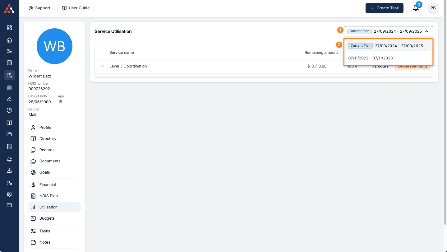We have added the ability to select a plan period within a participants profile, in the utilisation menu. This is a handy way to see your budget and how it was spent in a participants previous plan.