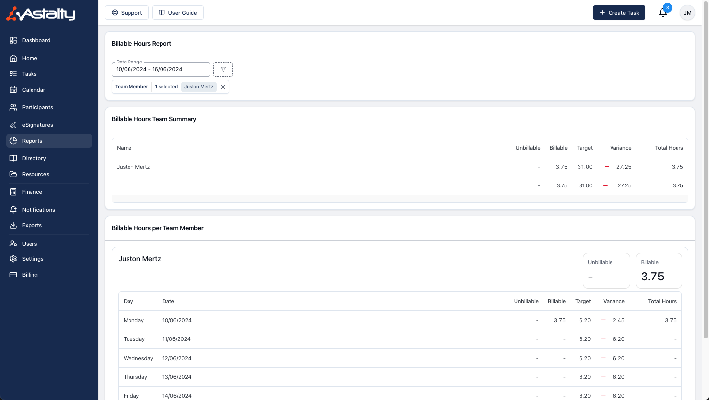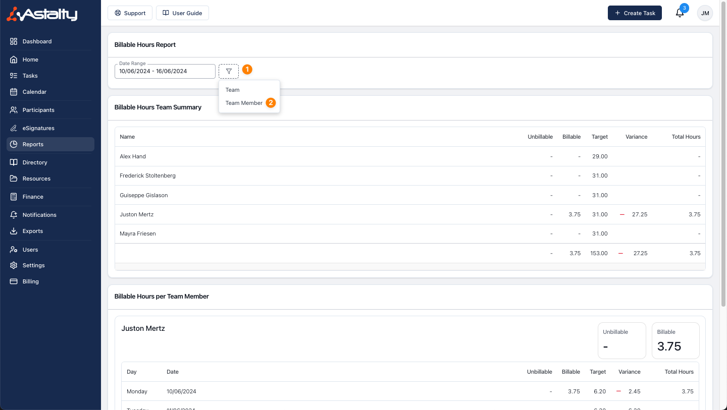 The billable hours report now includes a filter that allows users to view data specific to individual team members. Previously you could only filter by team. This enhancement provides greater oversight and control over the billable reporting process. Managers can easily track the billable hours of each team member, facilitating better performance assessments and more accurate KPI tracking. You can find the report here https://app.astalty.com.au/reports/team/billable-hours
