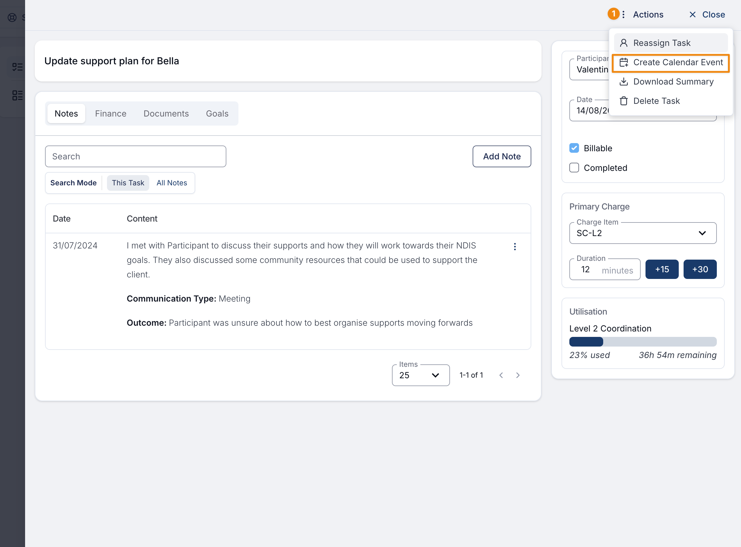 You can now create Calendar Events from Existing Tasks to do this navigate to an existing task. Once in here you will see the actions button. Click the actions button and you will now see a 'Create Calendar Event'