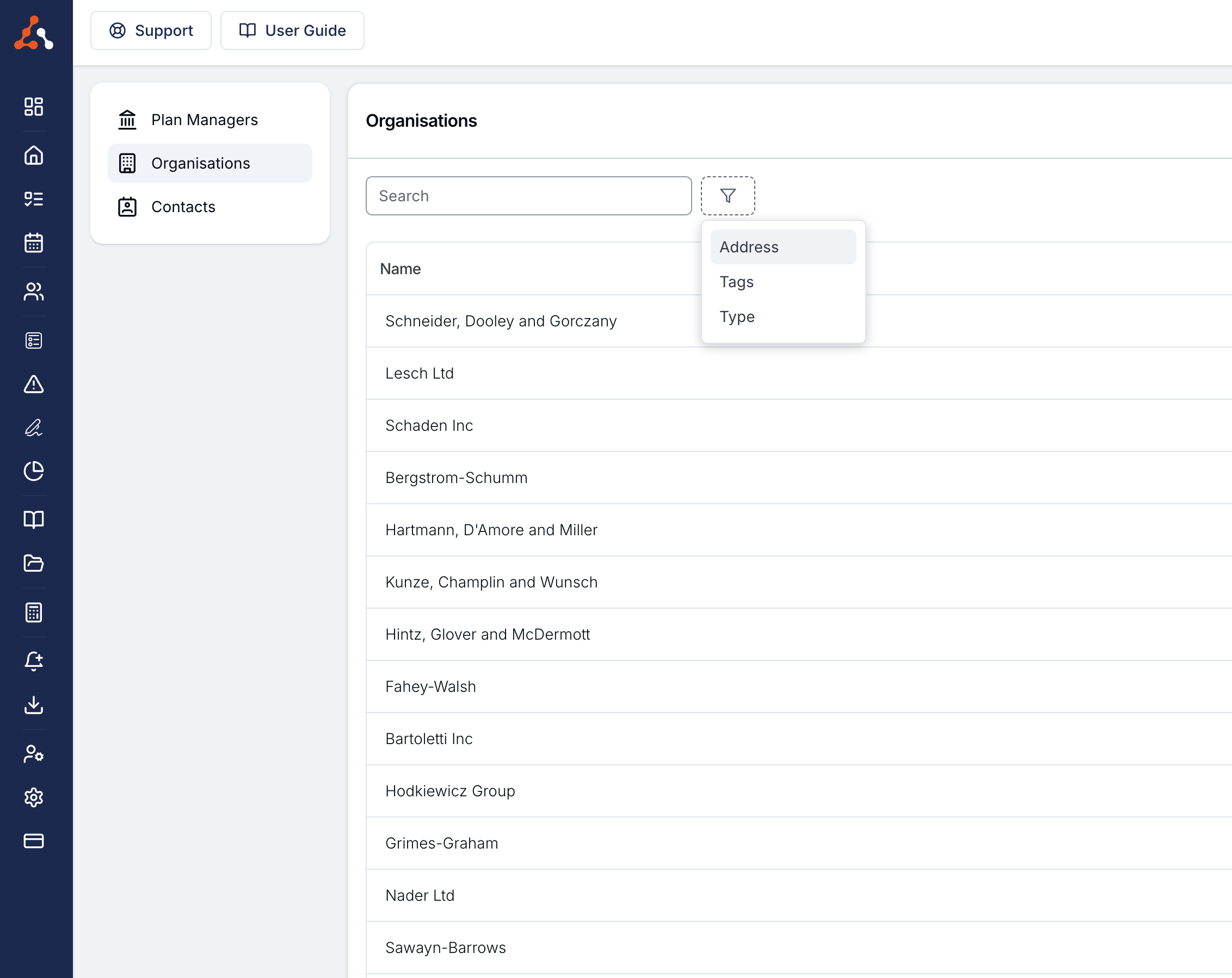 You can now filter by address within the organisations menu. Within the filter if you type the location you would like to filter by eg Suburb the menu will update to reflect the filter.