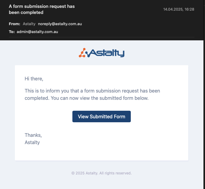 When an Astalty User sends out a Form submission request to someone, they will now receive an email when the person finishes and submits the form. Please keep in mind that this is only for a form submission that was explicitly requested, not for all submissions.