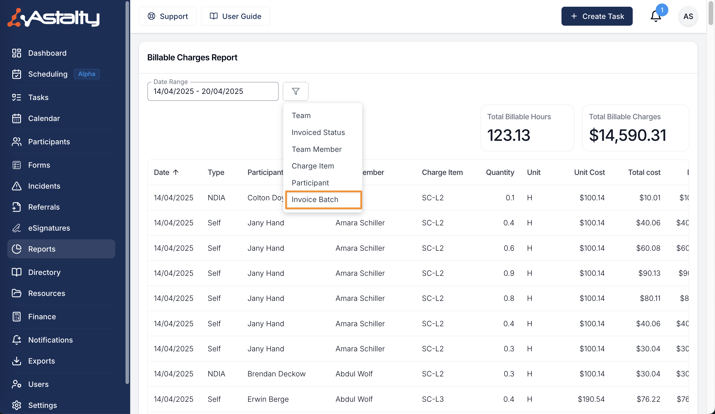 We have added a Invoice Batch filter to the Billable Charges Report this will allow you to filter the report by invoice batch to identify participants, and team members in more detail that are associated to charges within the batch.