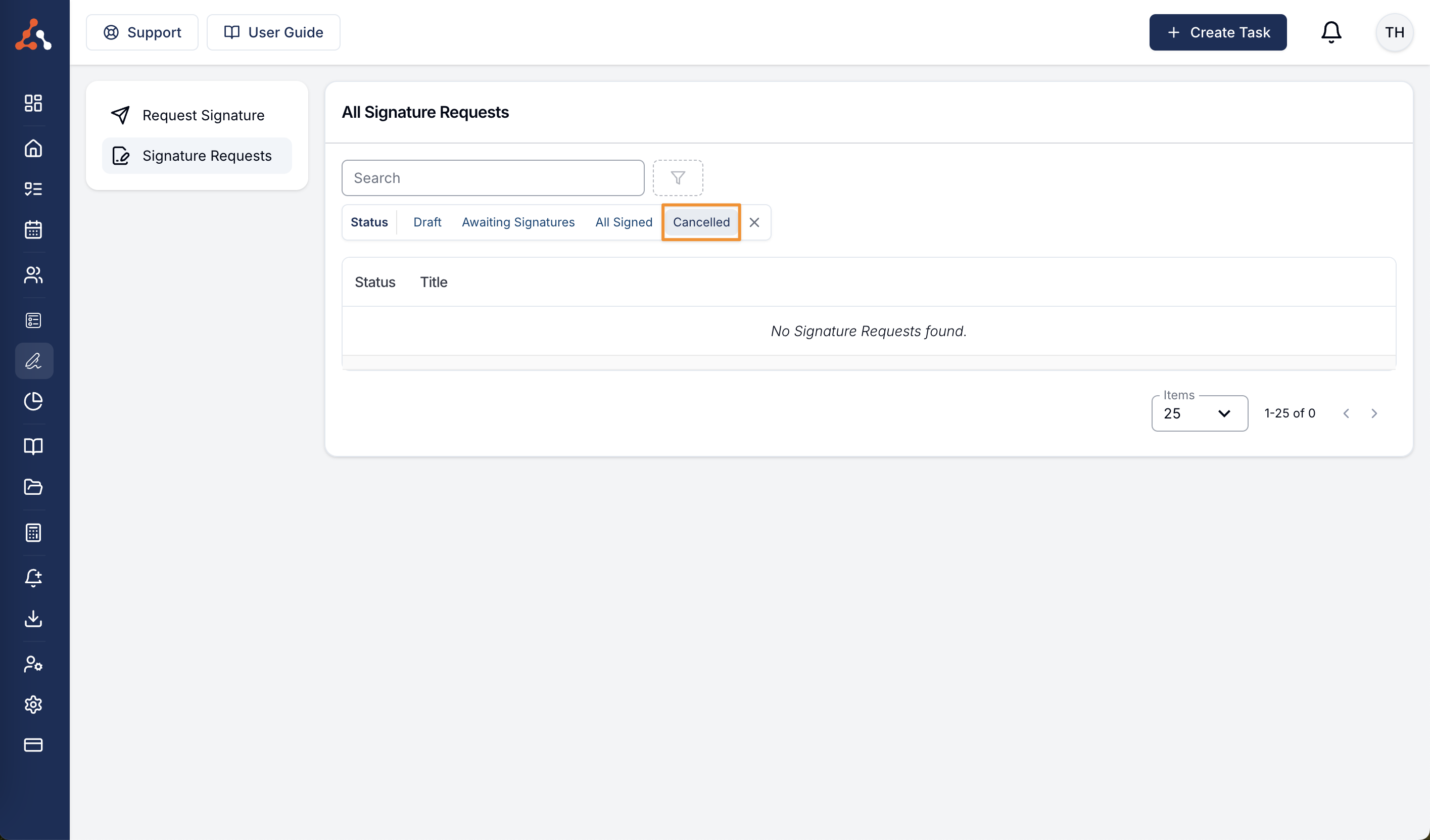 We have now updated the cancelled eSignature requests to now be hidden by default. To view cancelled eSignature requests simply apply the status filter and select the 'cancelled' option to see cancelled requests.