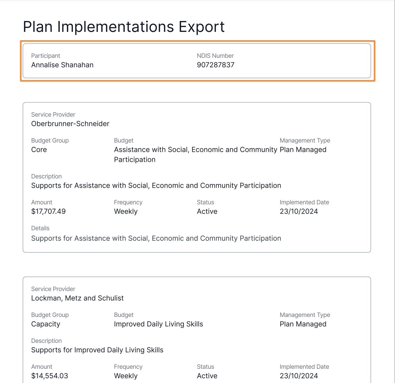 We have updated the implementation summary to include the participants details. The summary now includes the participants full name and also their NDIS number.