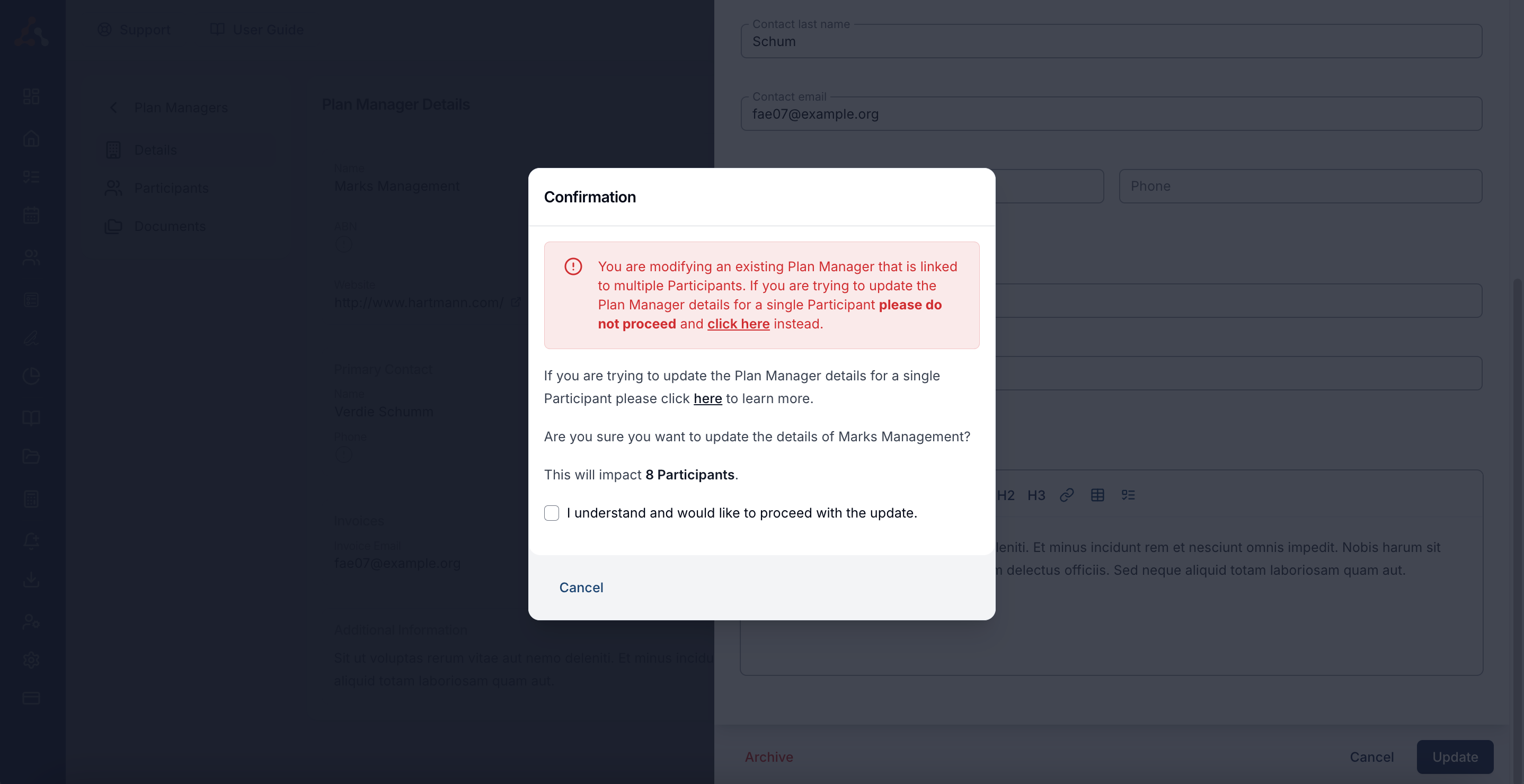 When changing a plan manager's details, you will now receive the prompt below confirming that you would like to continue with the change of details. We have introduced this due to users mistakenly updating the plan manager details rather than a participants plan manager.