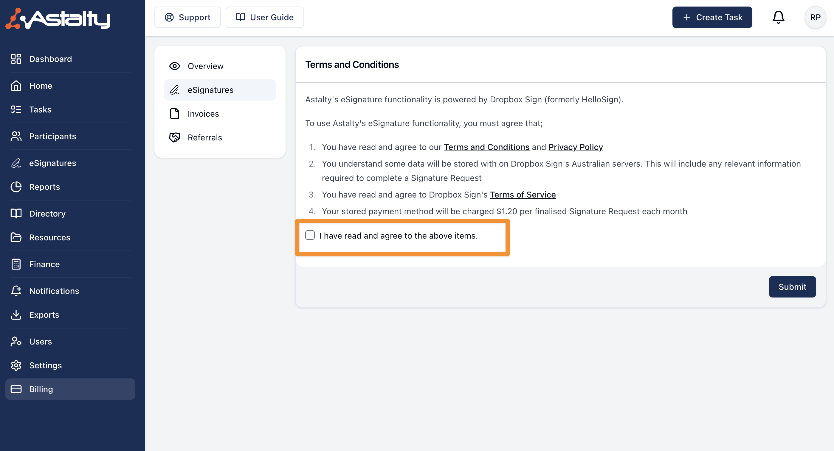 Before any users can send eSignatures the Account Owner must accept the eSignature Terms and Conditions which can be found on the eSignature billing page.