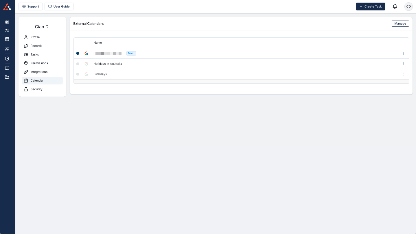 To enable these features you will need to navigate to your User Account. For more information on how to find this click here. Once in your user settings you will see two new selections, Integrations and Calendar see below for more details.