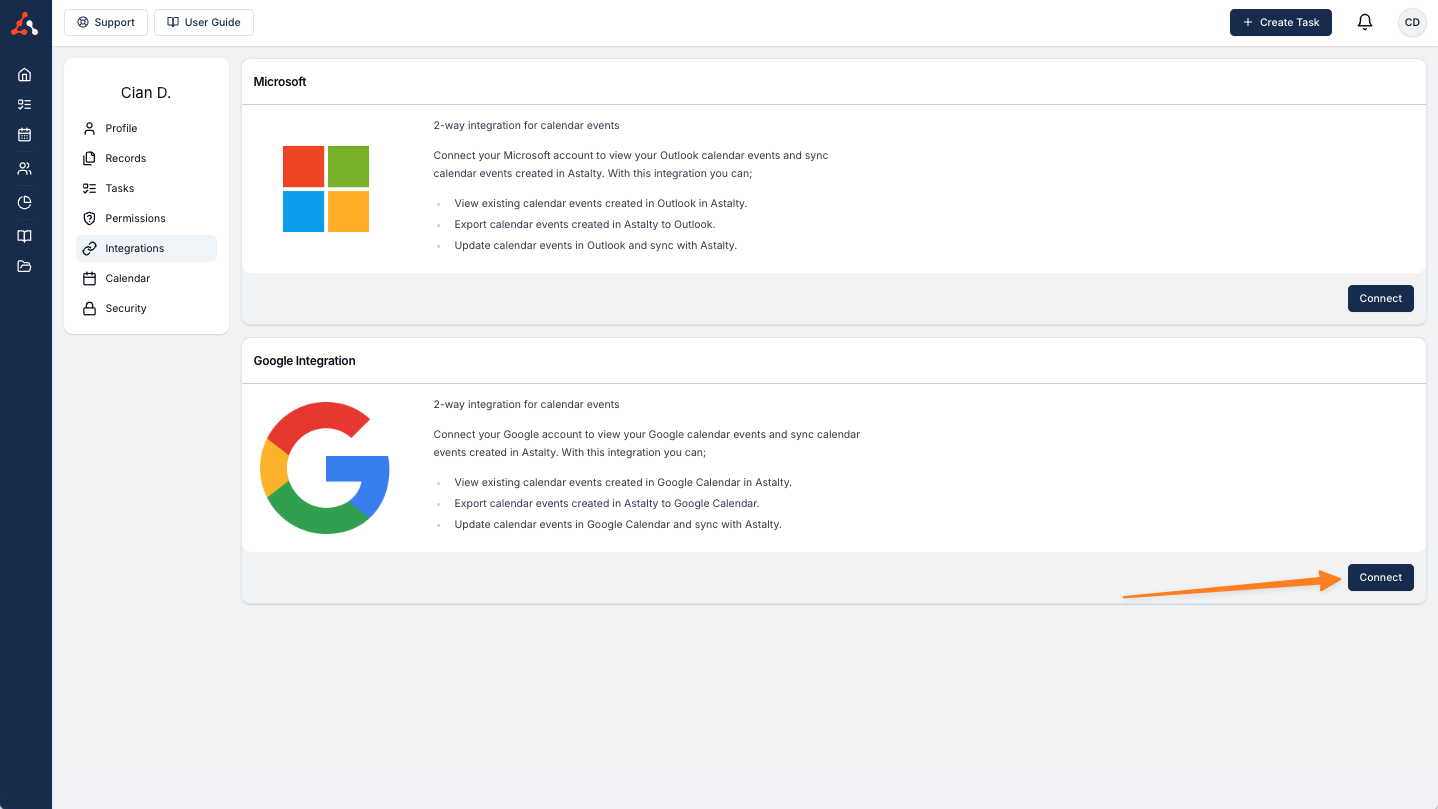 To set up your Google Calendar integration is a relatively simple process. You will just have to follow the connection prompts from Google. First select the Google Calendar Integration 'Connect' button.