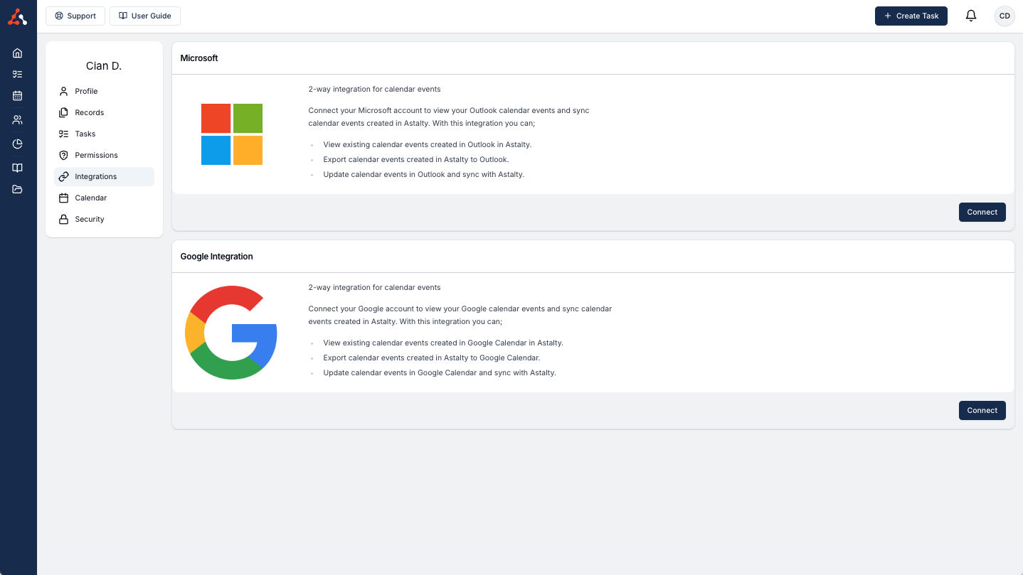 Click into the Integrations menu item and you will see the option to select either an Outlook Calendar Integration or a Google Calendar Integration.