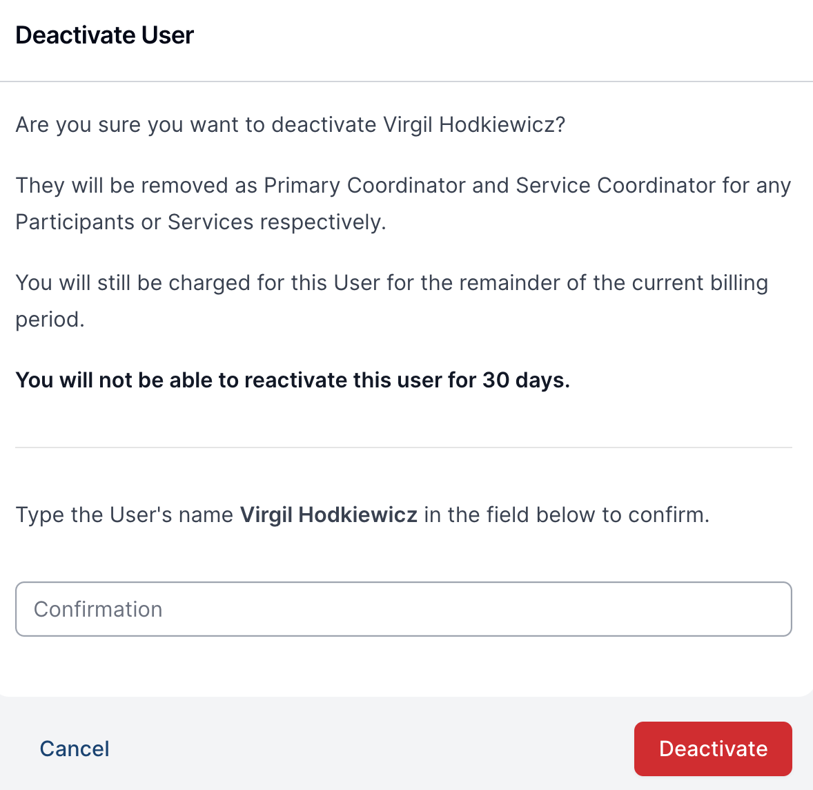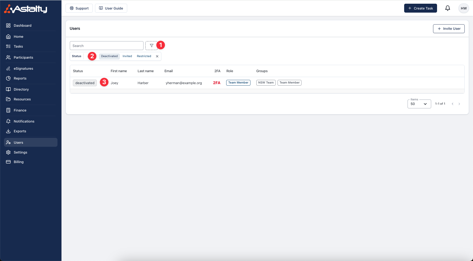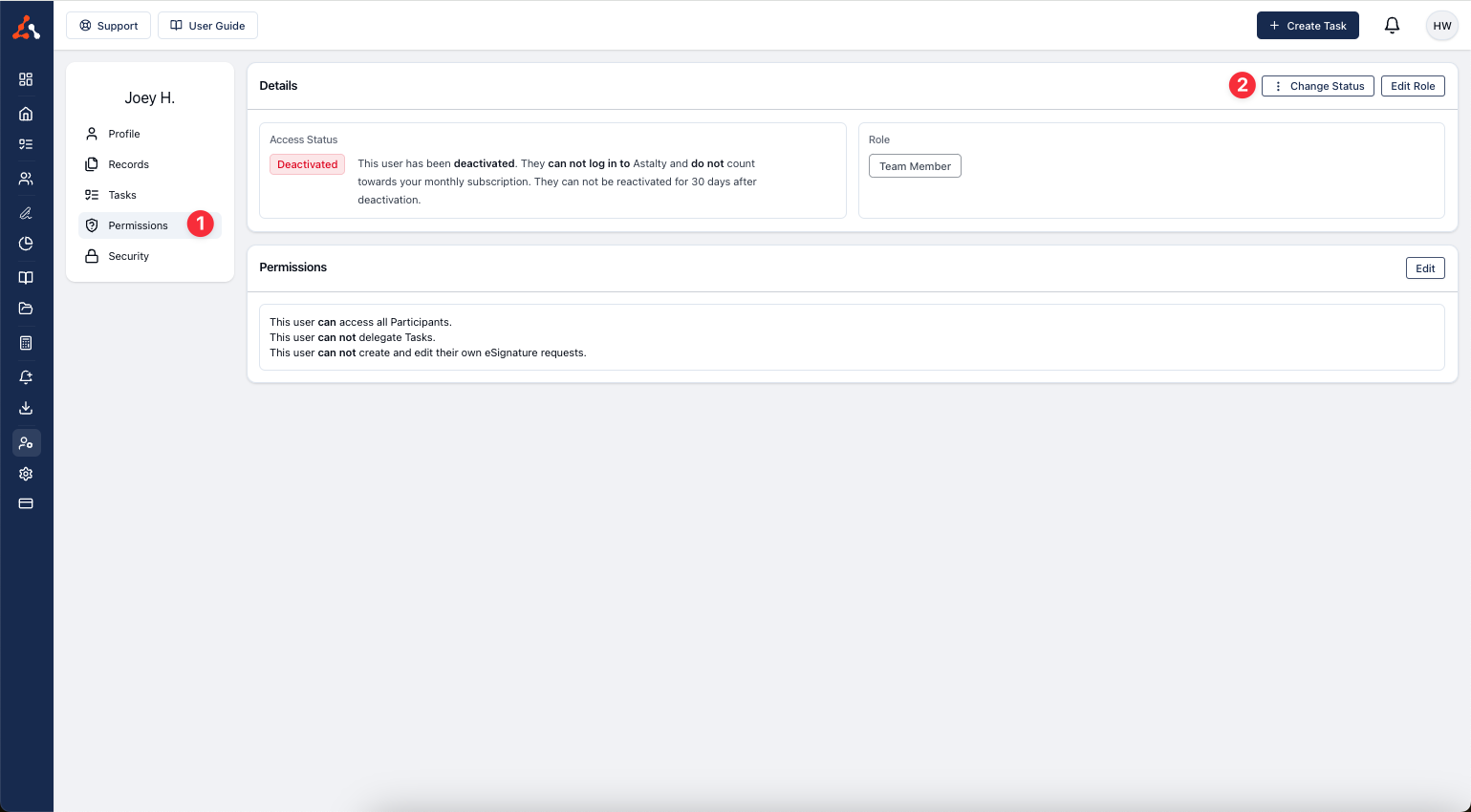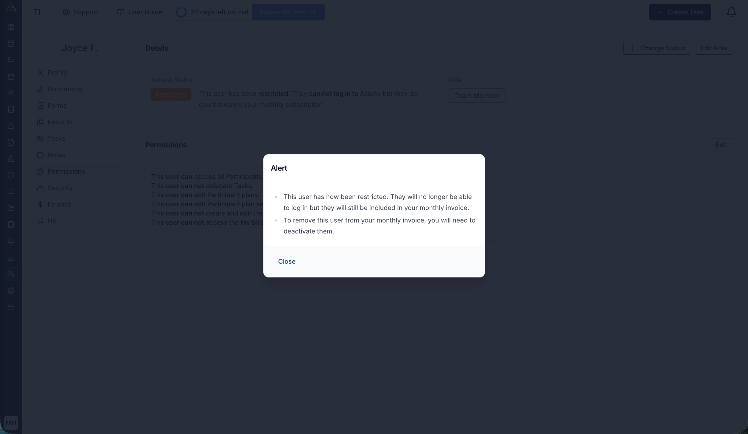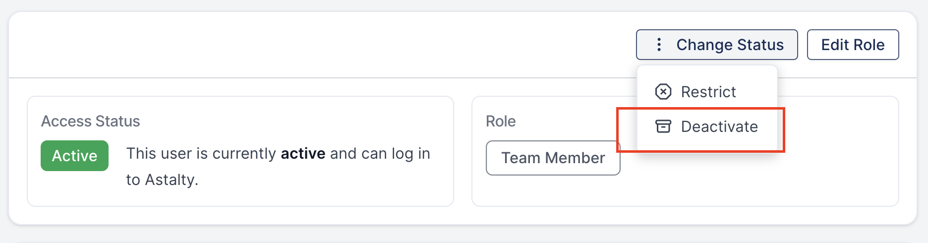 When you choose to deactivate a profile, Astalty will ask for your confirmation. You'll need to type in the name of the user whose profile you want to deactivate to confirm your decision. This will restrict the User's account, and they will no longer be able to log in to Astalty.
