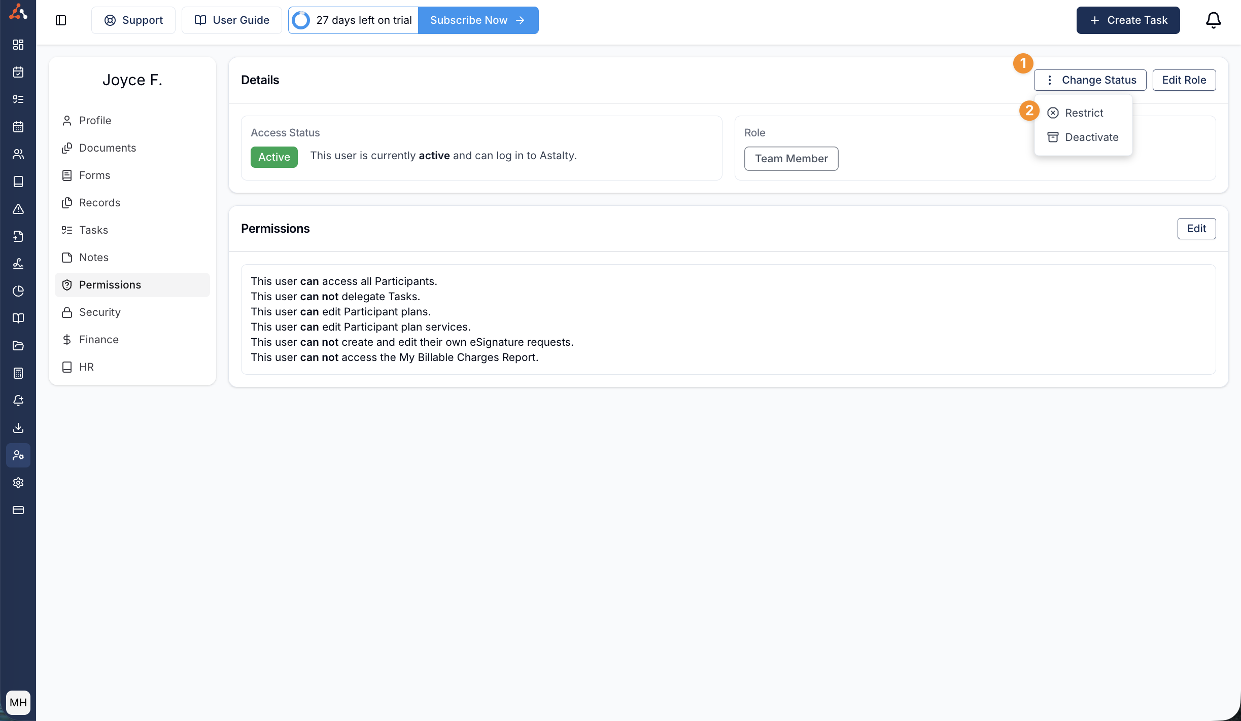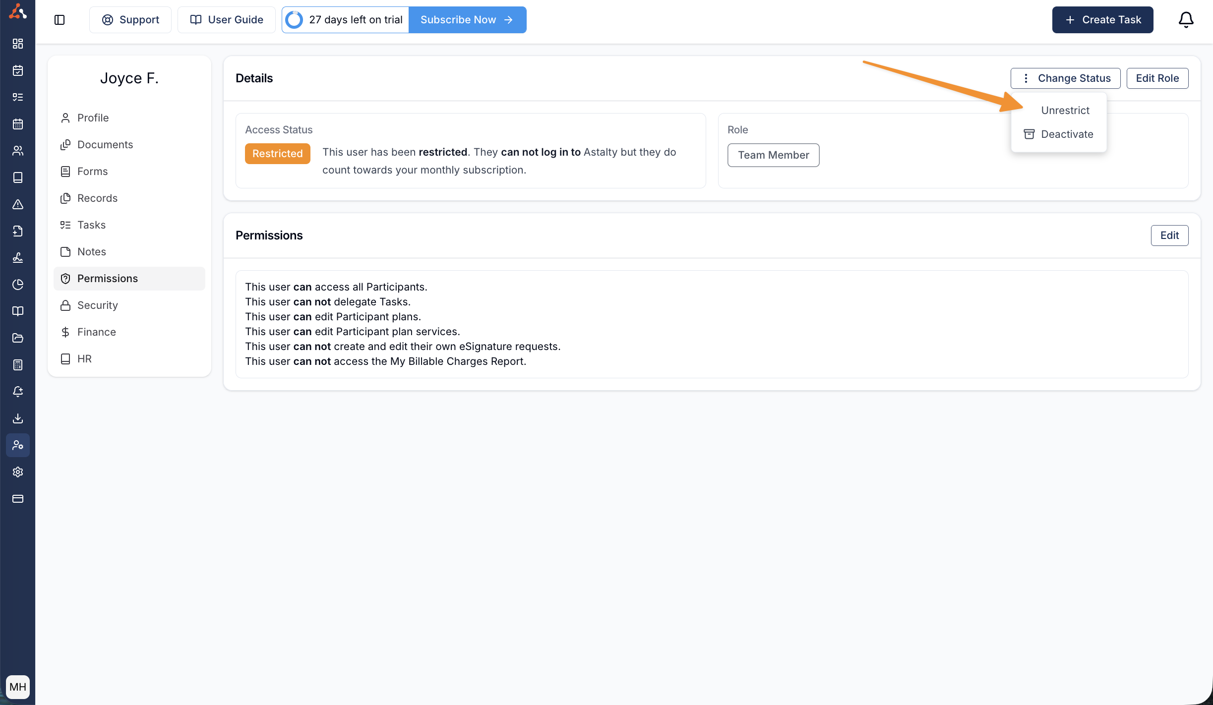 To restrict a user, click on the staff profile, click on the permissions tab on the left-hand side menu, click on ‘Change Status, ’ and then click on "restrict"