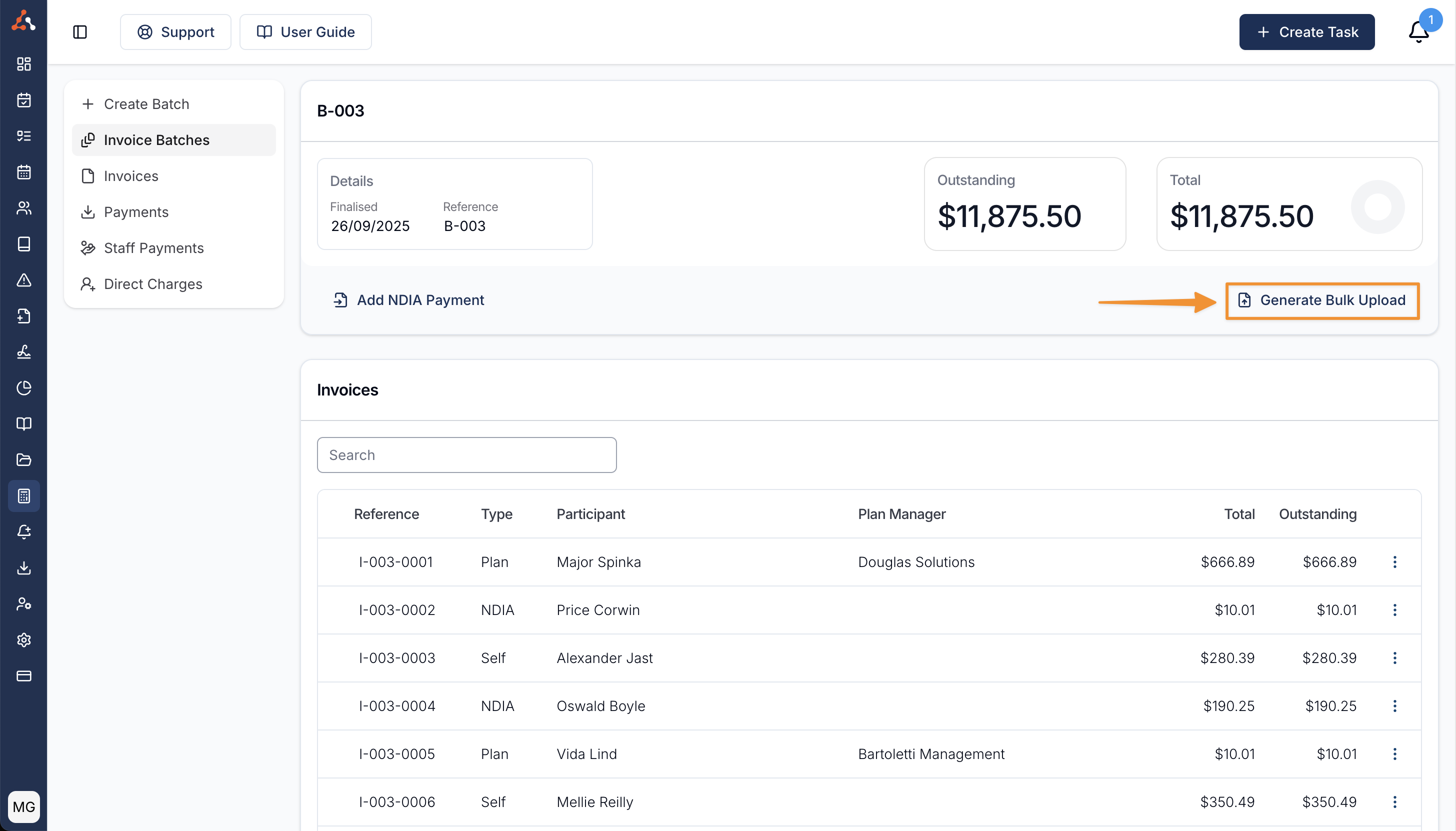 Once you are in the finalised batch, if the batch has NDIA managed charges you will see the Generate Bulk Upload file button. Click on this button and Astalty will download the CSV file for you to import into the portal.