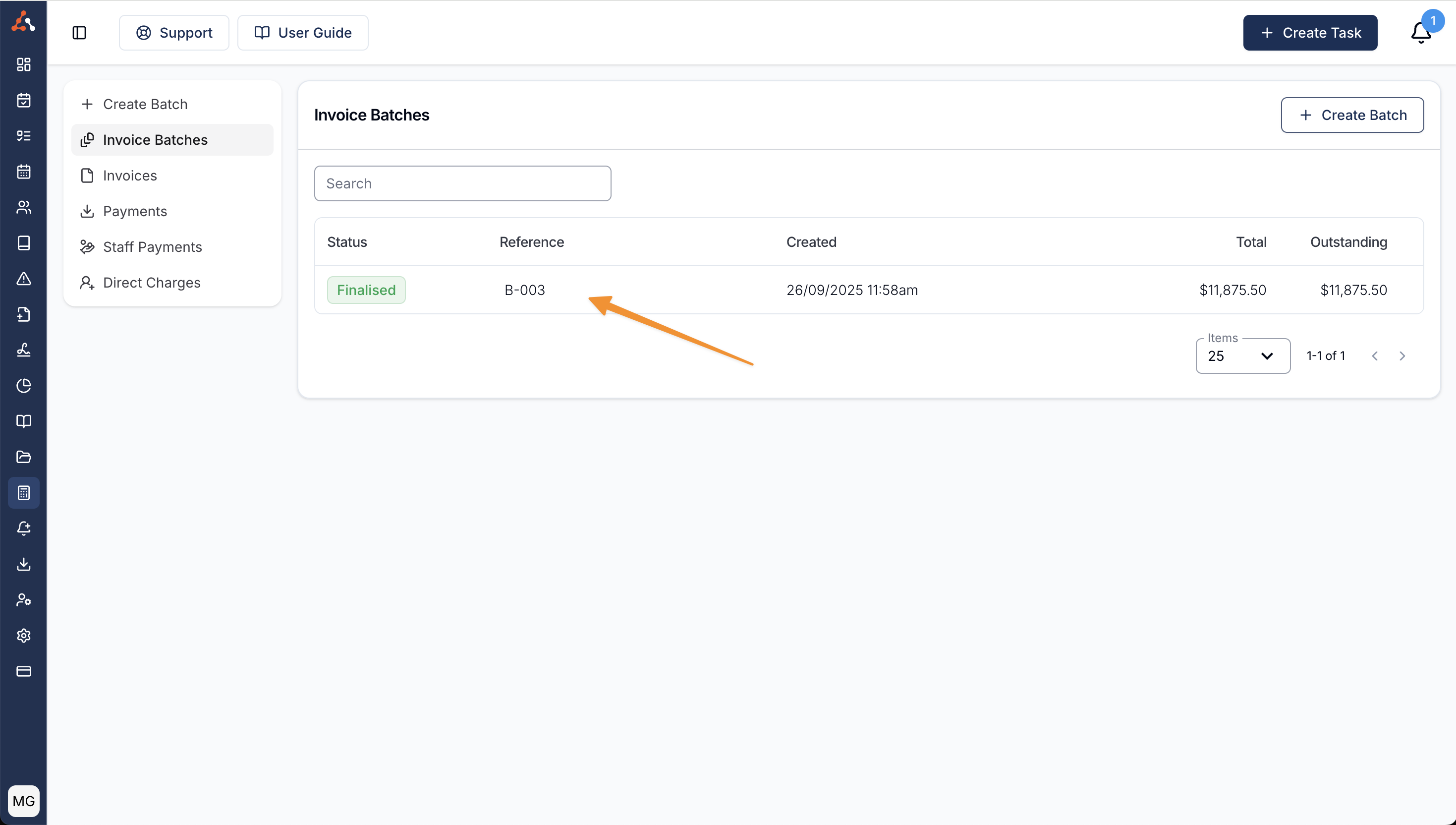 To generate the bulk upload file for a batch, the first step is to click into the Finalised batch from the Invoice Batches page.