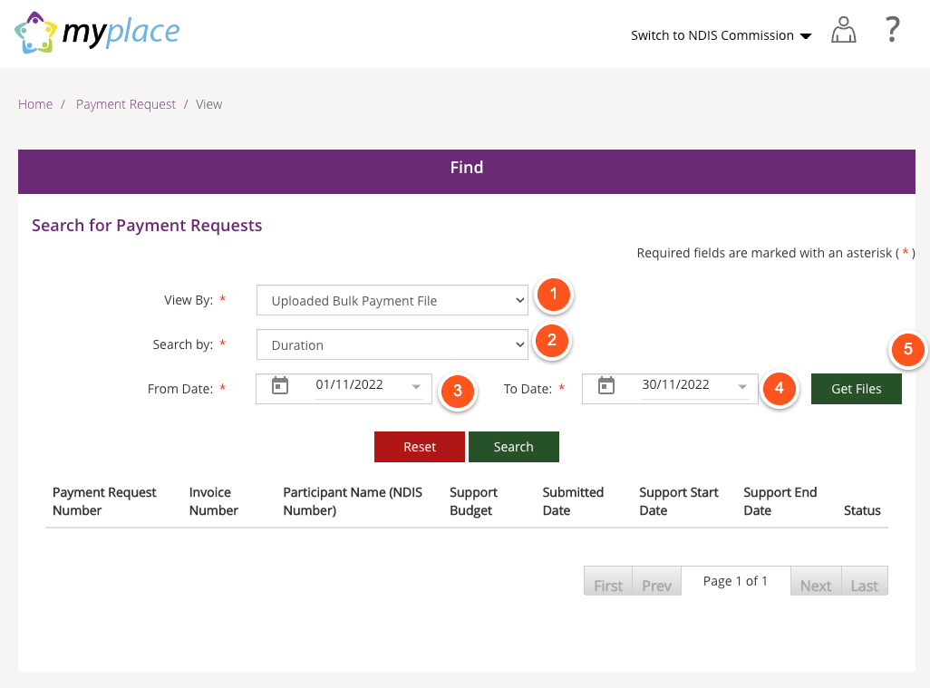 On the Search for Payment Requests screen, follow the steps outlined below in order to find the receipt file.