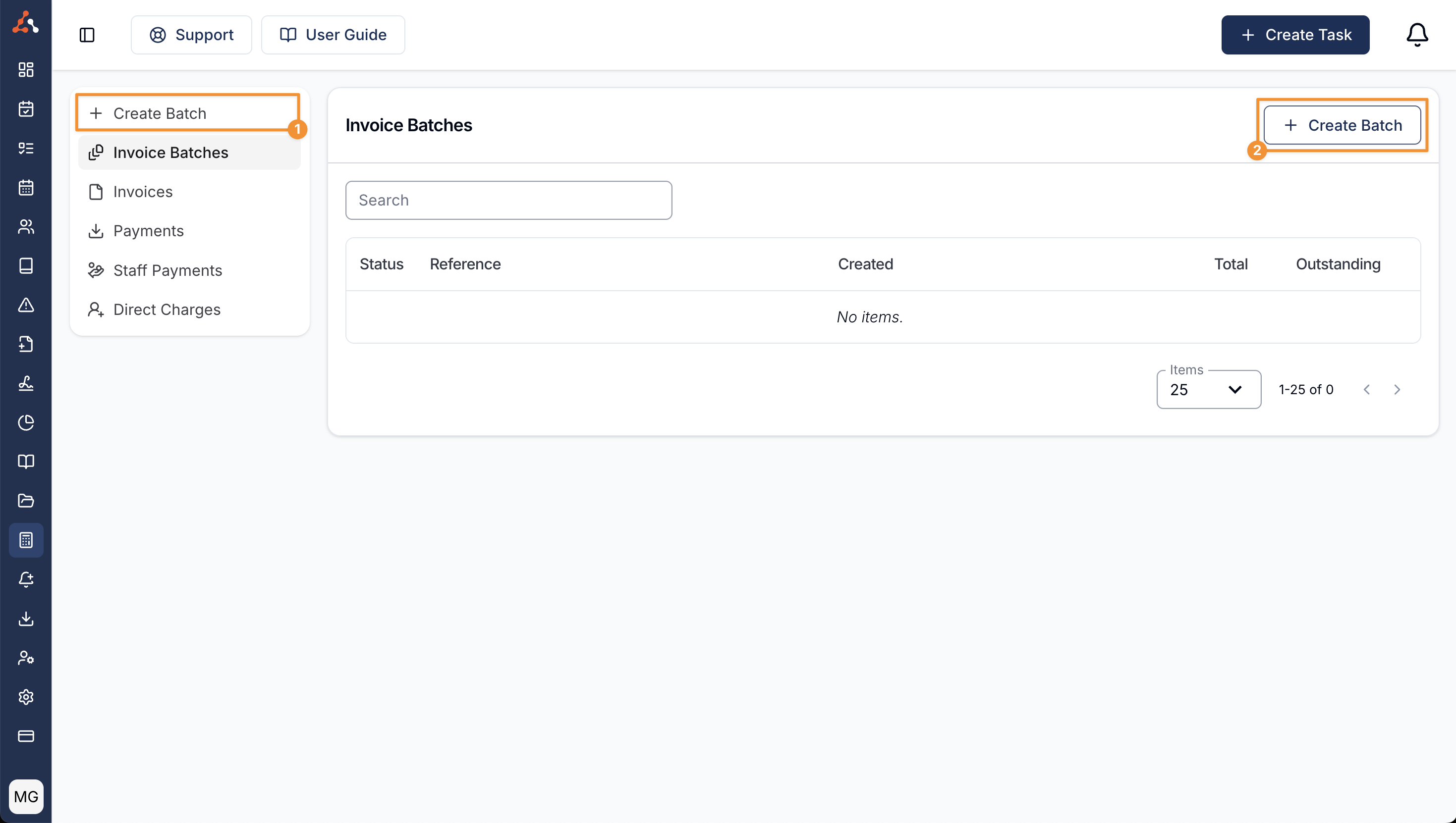 To create an Invoice Batch, you can head to the Invoice Batches page and click Create Batch (1) in the sidebar or towards the top right of the page (2).