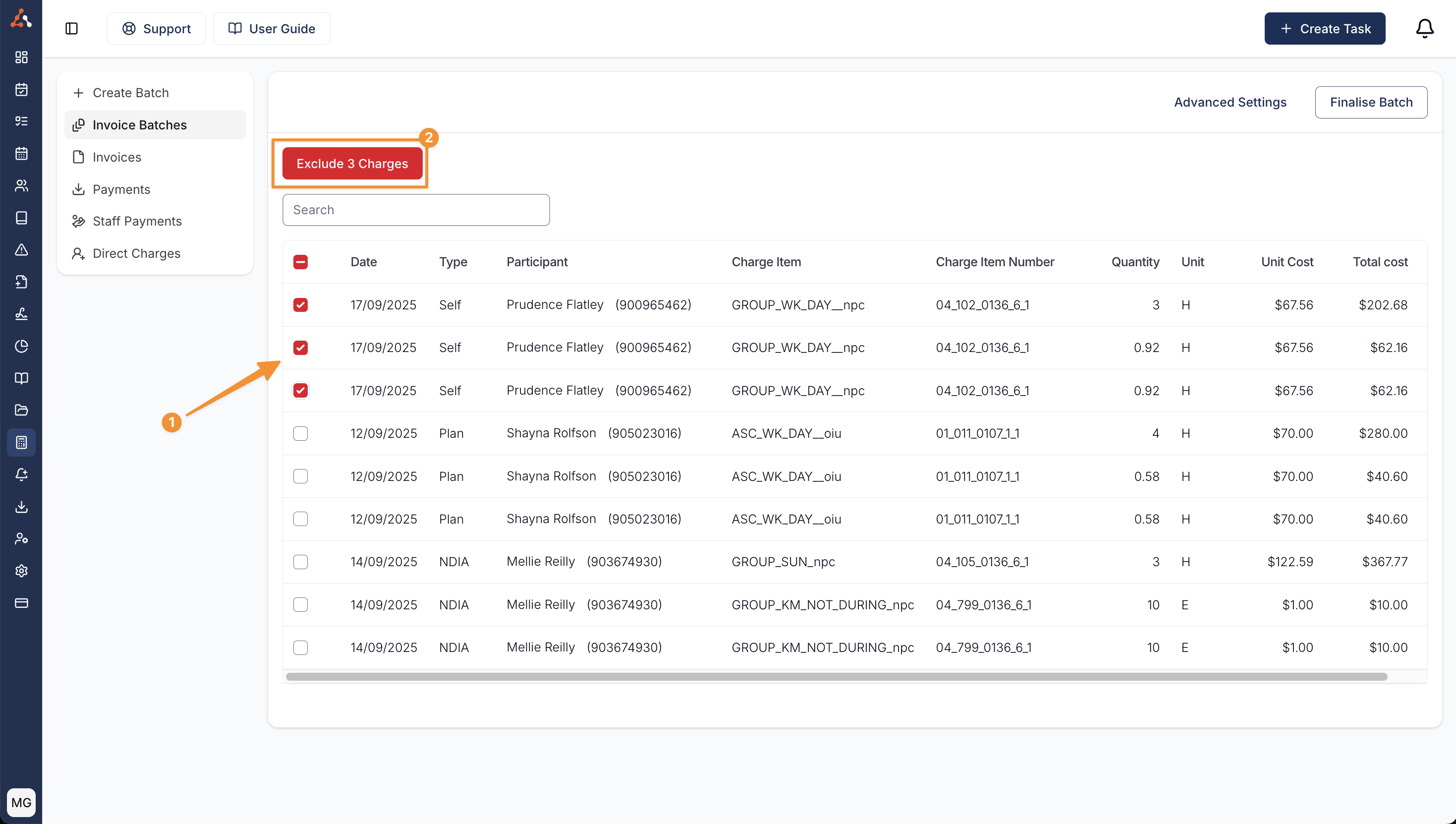 Sometimes you may want to exclude charges from a batch - they might be invalid or you just don't want to invoice for them yet. To do this click on the checkbox on the left hand side of the table to select them (1) and once selected click on the Exclude Charges button (2) to remove them from this batch.
