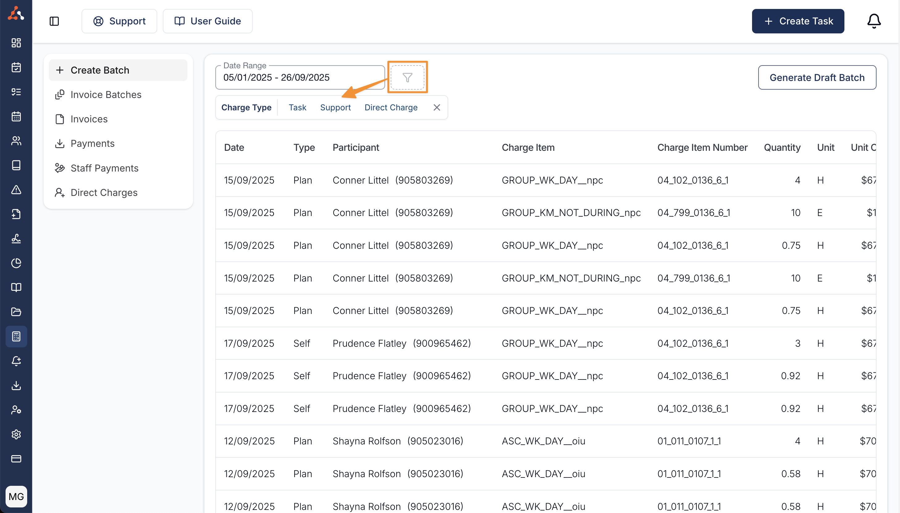 Charge Type: Before generating your draft batch, use the Charge Type filter to only show charges created by Task, Support, or Direct Charges.