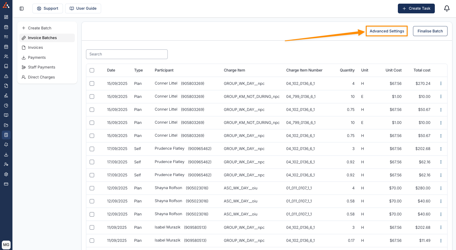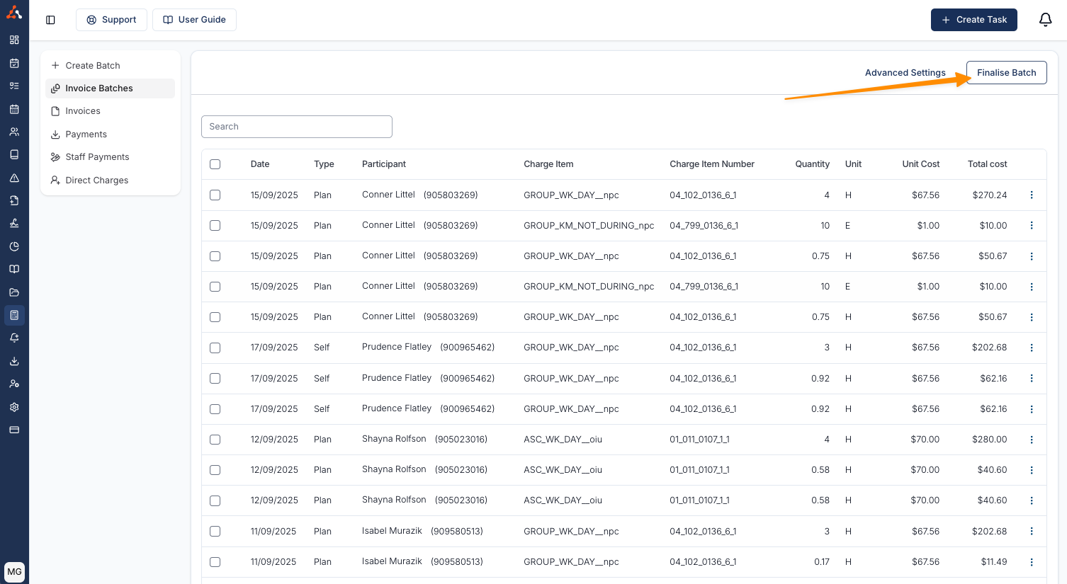 Once you have reviewed the invoice batch and you are happy with all charges, you can click the Finalise Batch button to finalise the Invoice Batch.