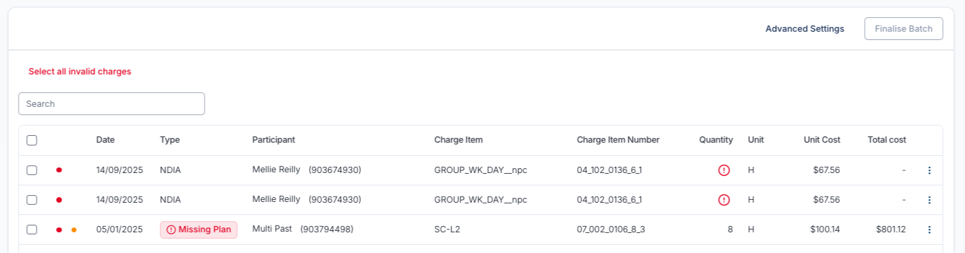 Astalty makes it easy to exclude all invalid charges with a Select all invalid charges button - if you click this, all invalid charges will be selected and you can exclude them from this batch. This allows you to finalise the valid charges and fix the invalid charges at a later date.