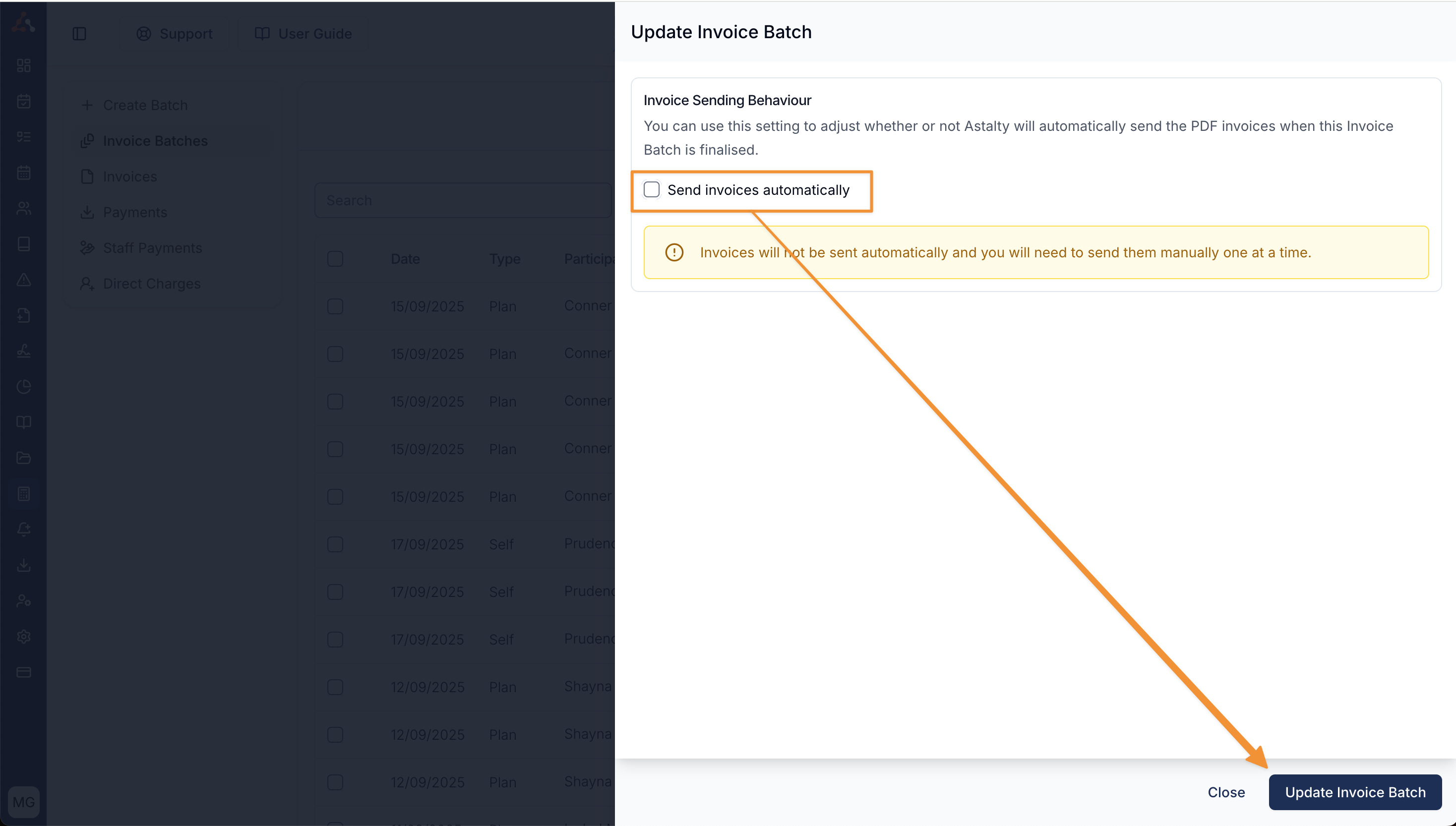 This setting can be useful if you want to make adjustments to an invoice such as applying a payment, before sending it to the Plan Manager. You will need to send each invoice one by one if you turn off automatic sending.