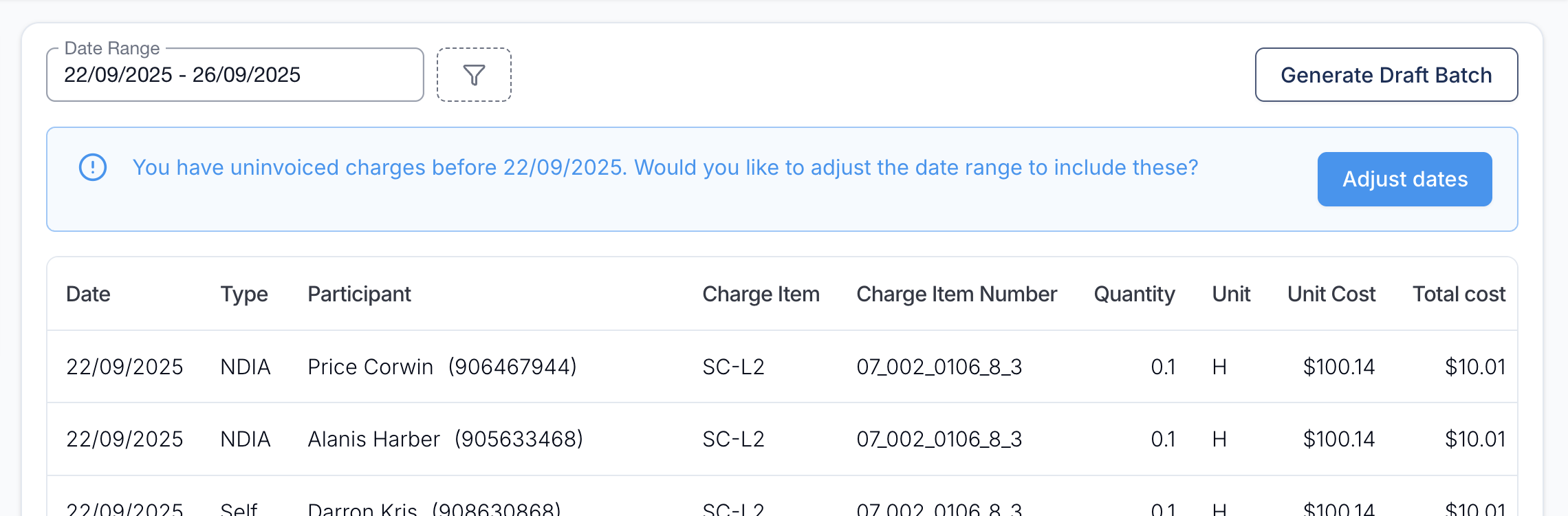 Sometimes you may see a blue warning starting "you have uninvoiced charges before [start date]". This means that Astalty has found charges outside of the selected date range that have not yet been invoiced. If you click on the Adjust Dates button, Astalty will automatically adjust the date range to ensure all uninvoiced charges are included in the draft batch.