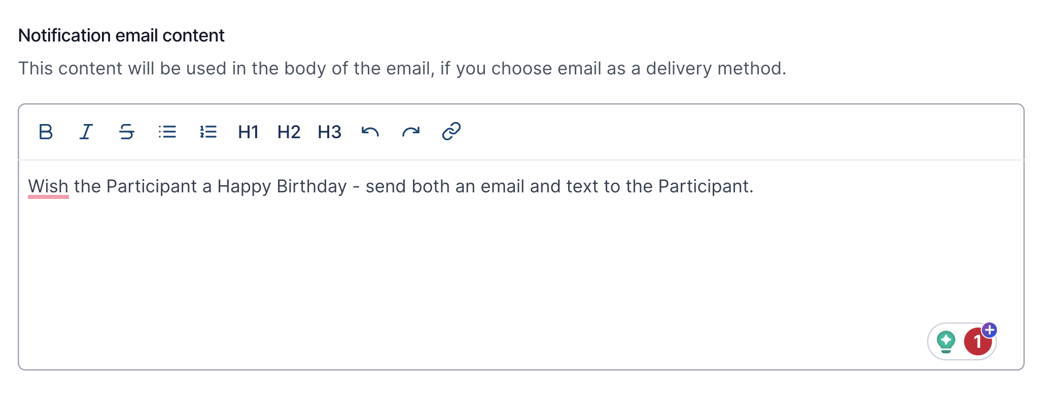 This is where you can add additional information based on the notification. For example, you could add the details of what your organisation normally does for Participant birthdays.