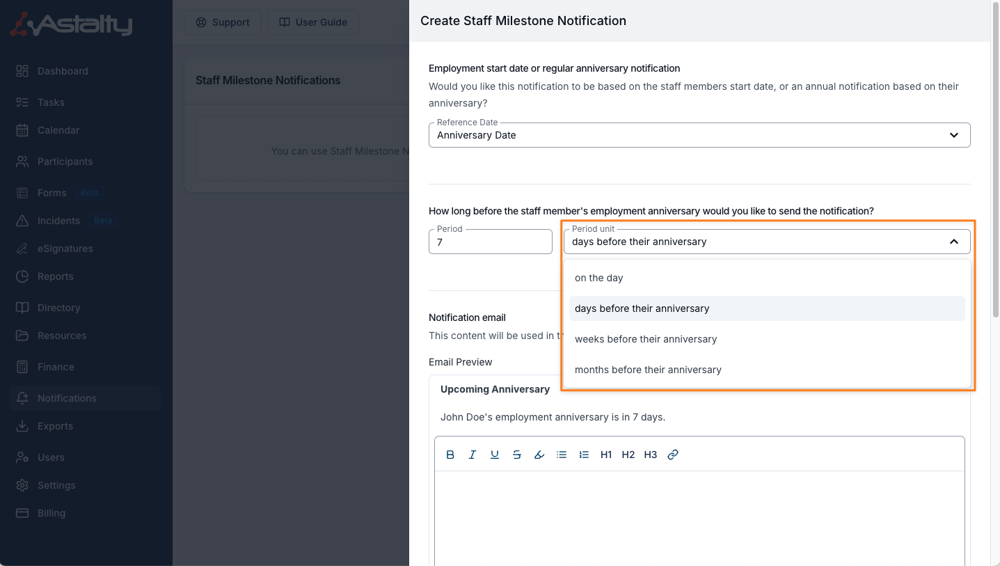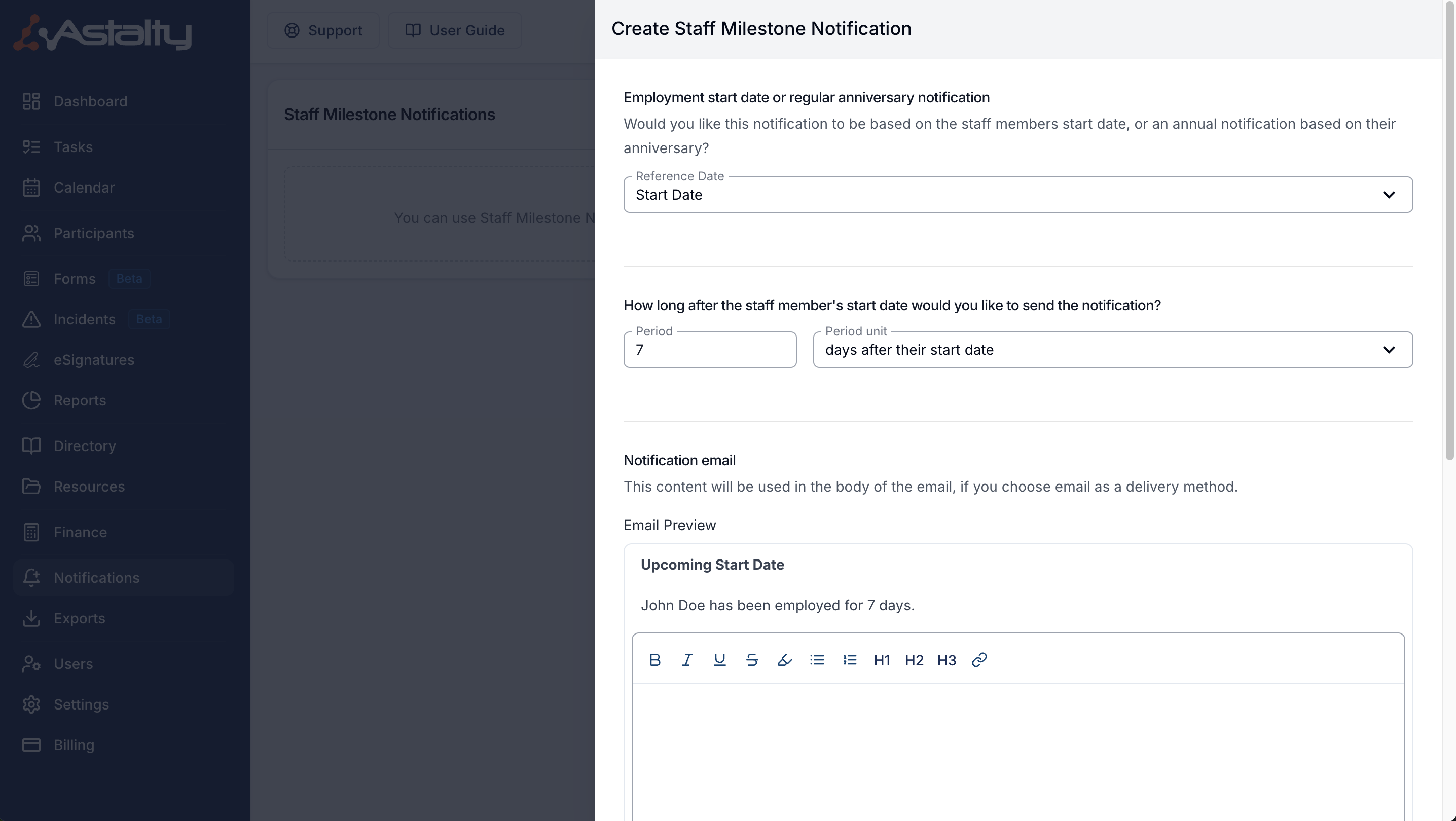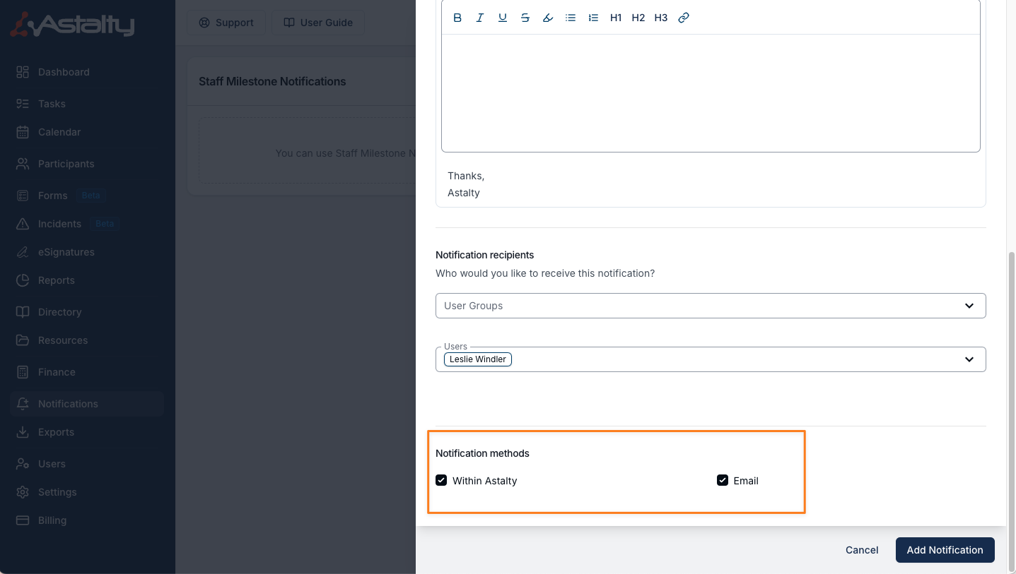 Following this you will have to select the notification type, if you would like this notification to be sent via email, within Astalty, or both!