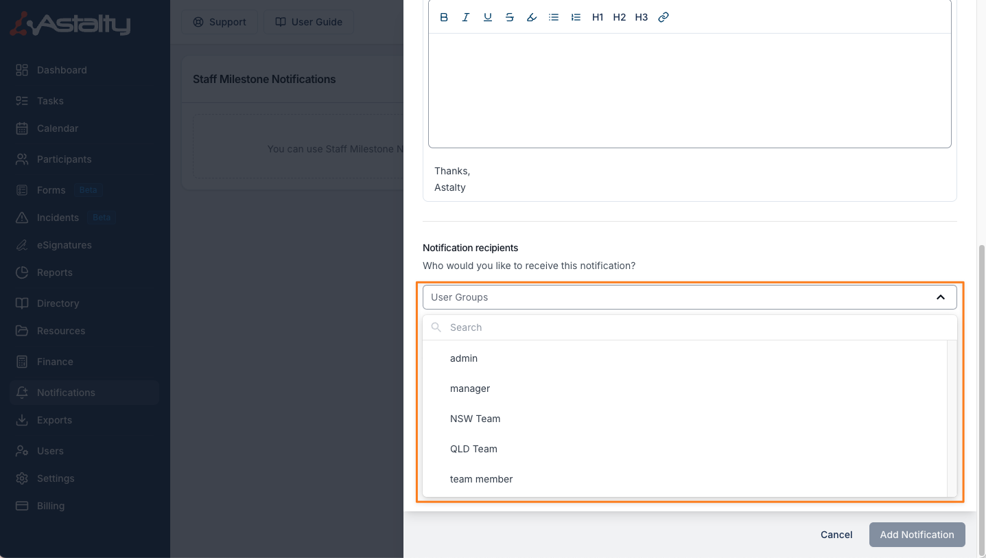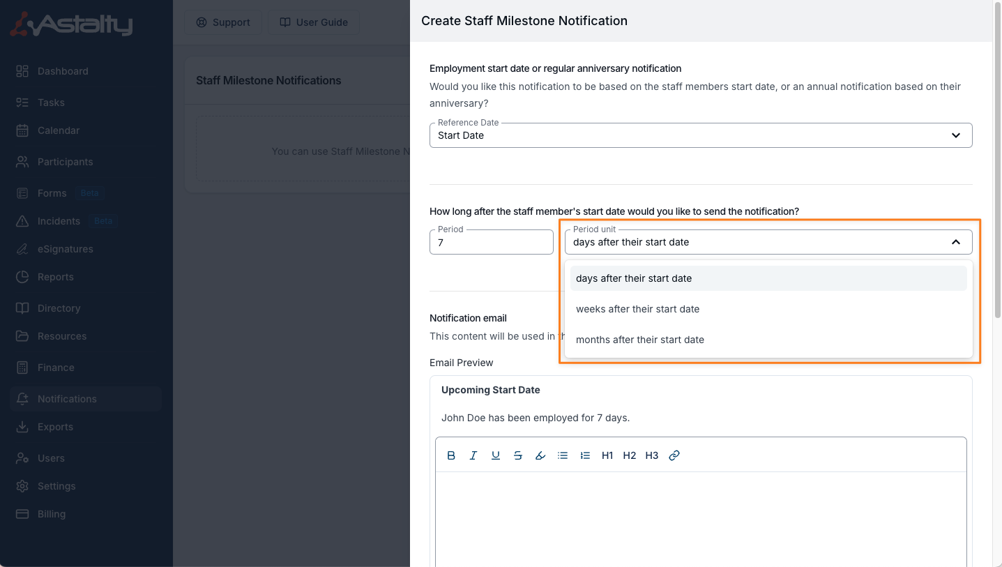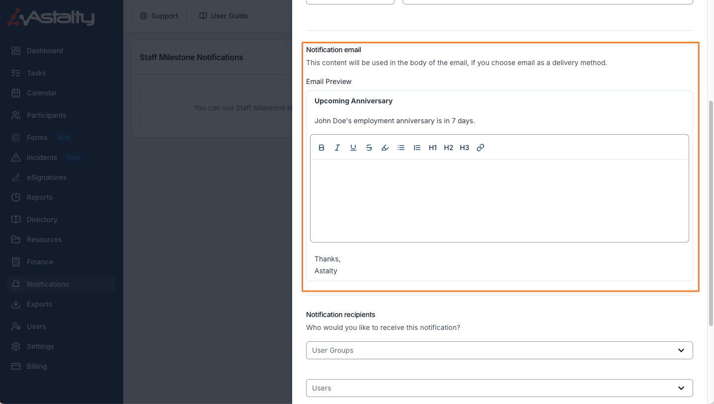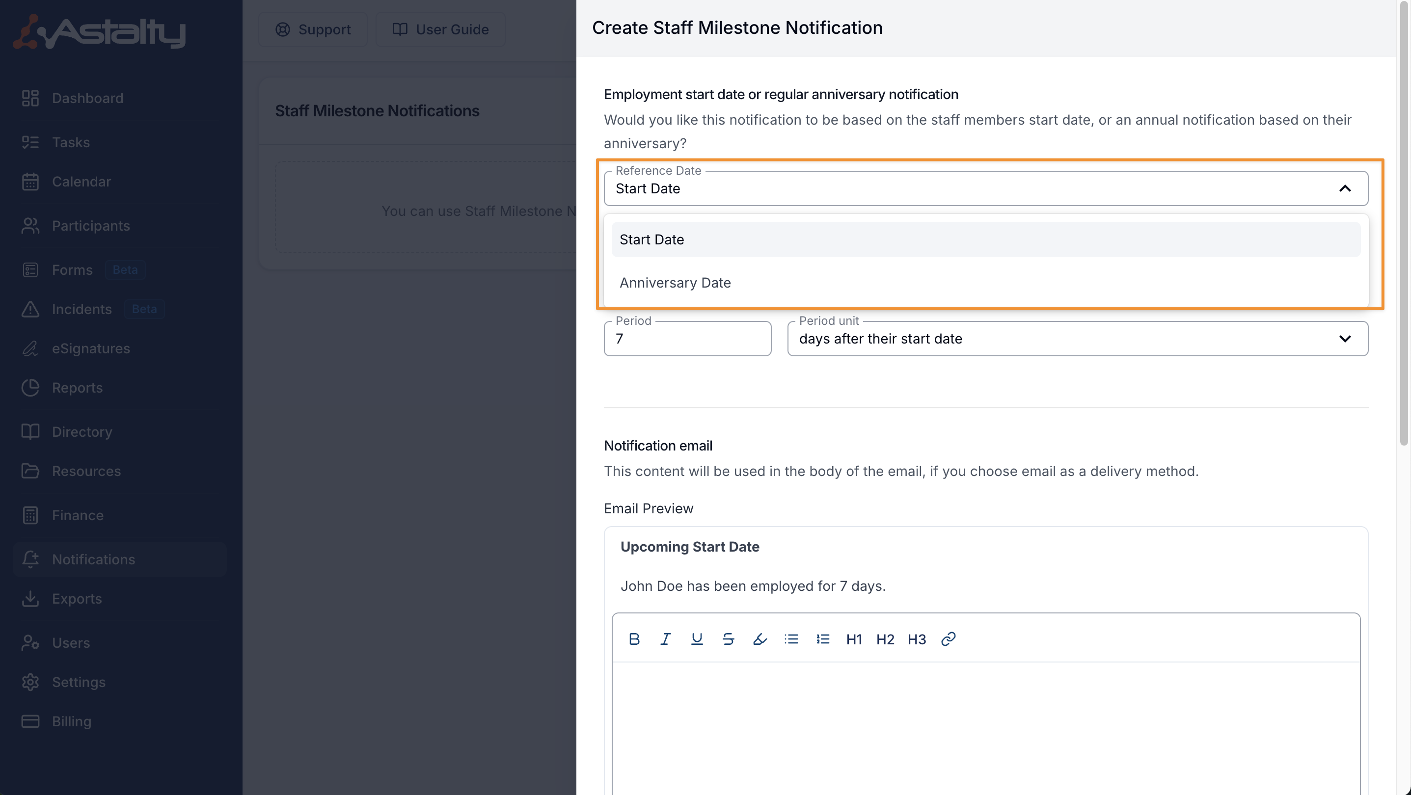 Following this you will have to select the notification type, if you would like this notification to be sent via email, within Astalty, or both!