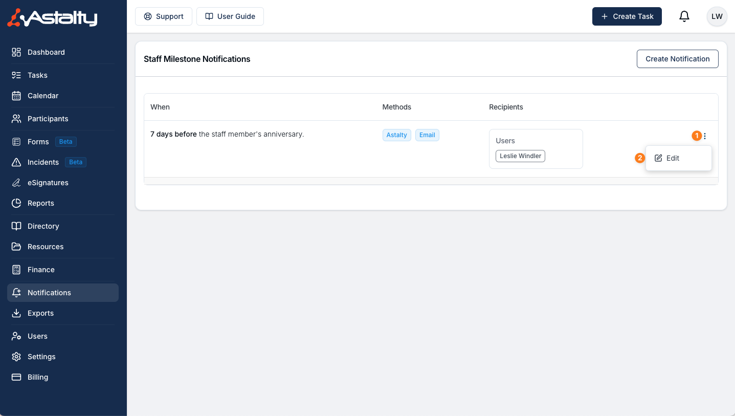 Once you have created a Staff Milestone notification, you can then edit the notification by clicking the 3 dots to the right of the entry. Once you do this you will see the 'Edit' option. If you select this you will be brought to the notification configuration screen.