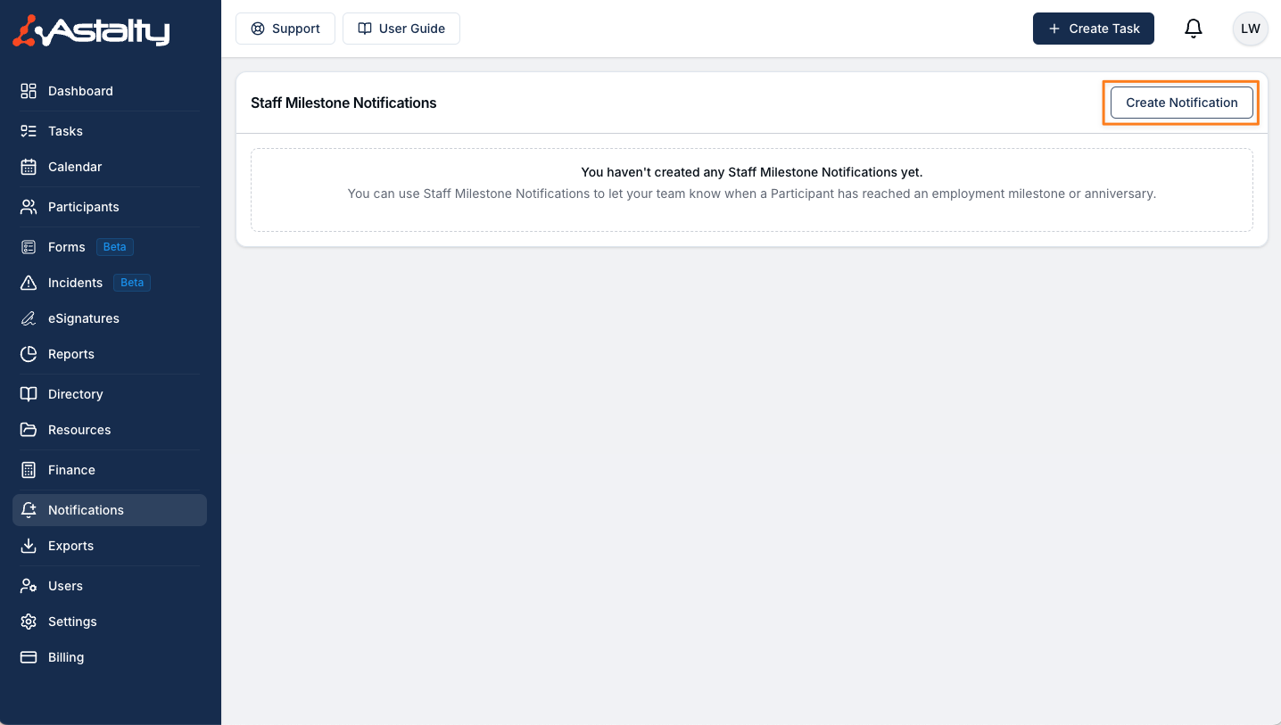 Within the Staff Milestone Notification screen you can select 'Create Notification' to start the process of creating a Milestone Notification.