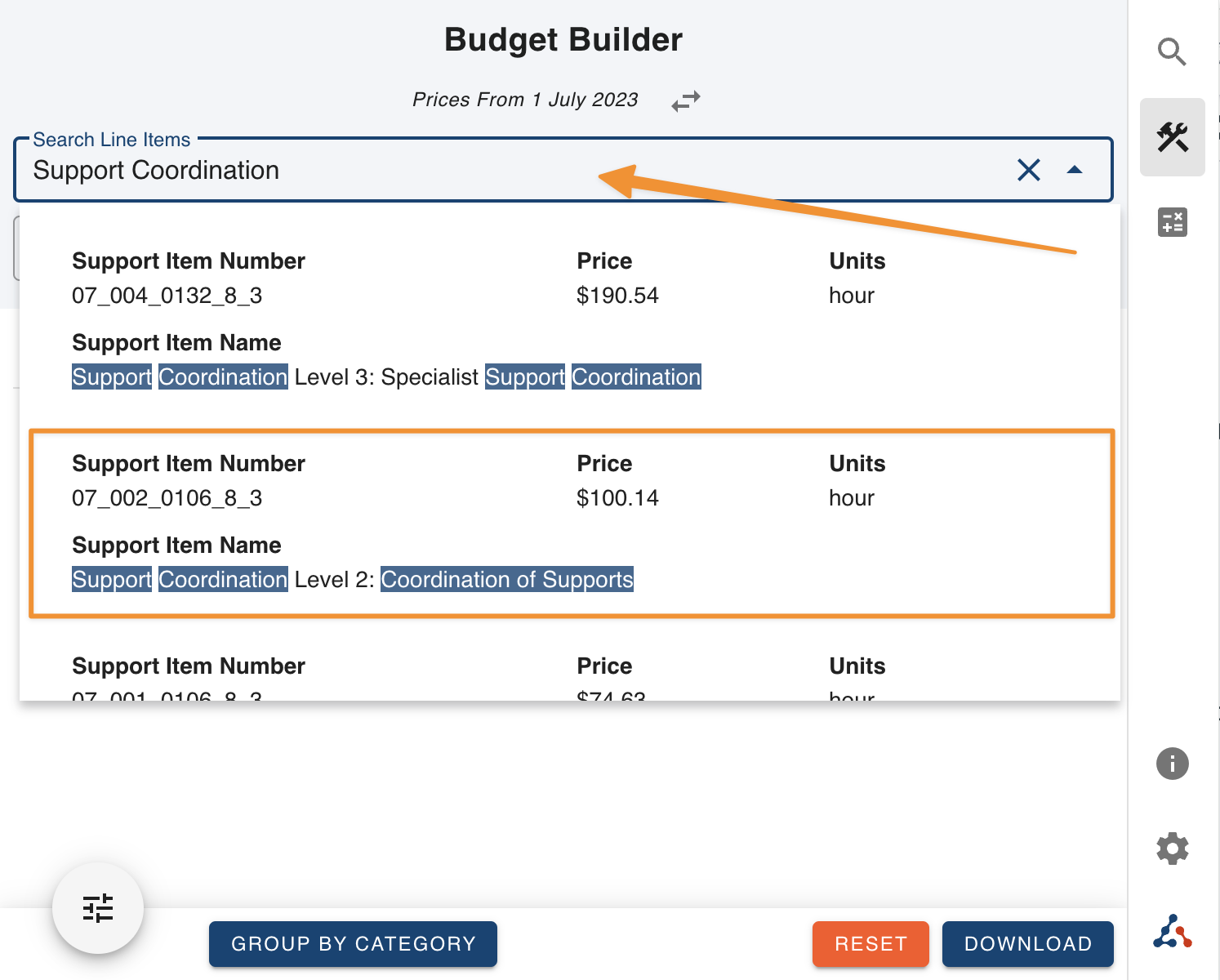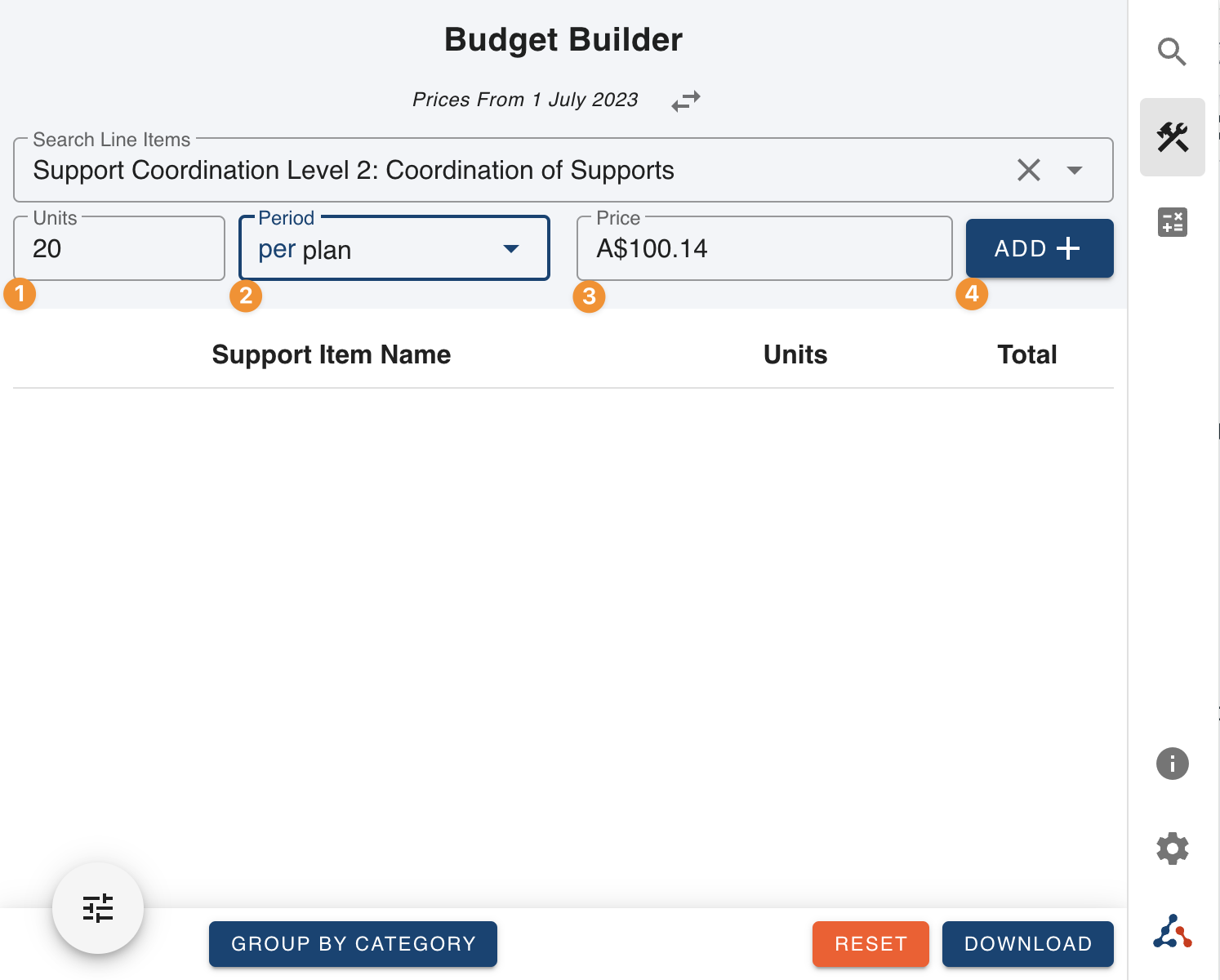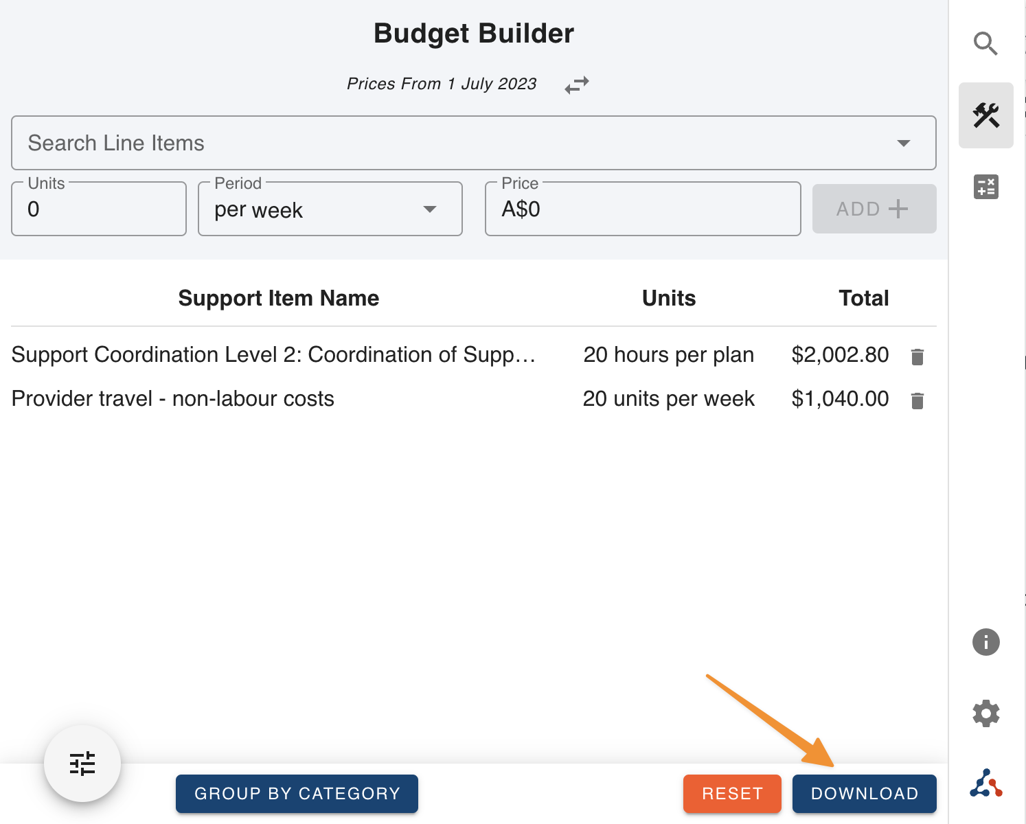 Once you have added the Support Items you would like to budget for you can then export this budget by clicking download in the bottom right corner. This will export this budget as a .csv file.