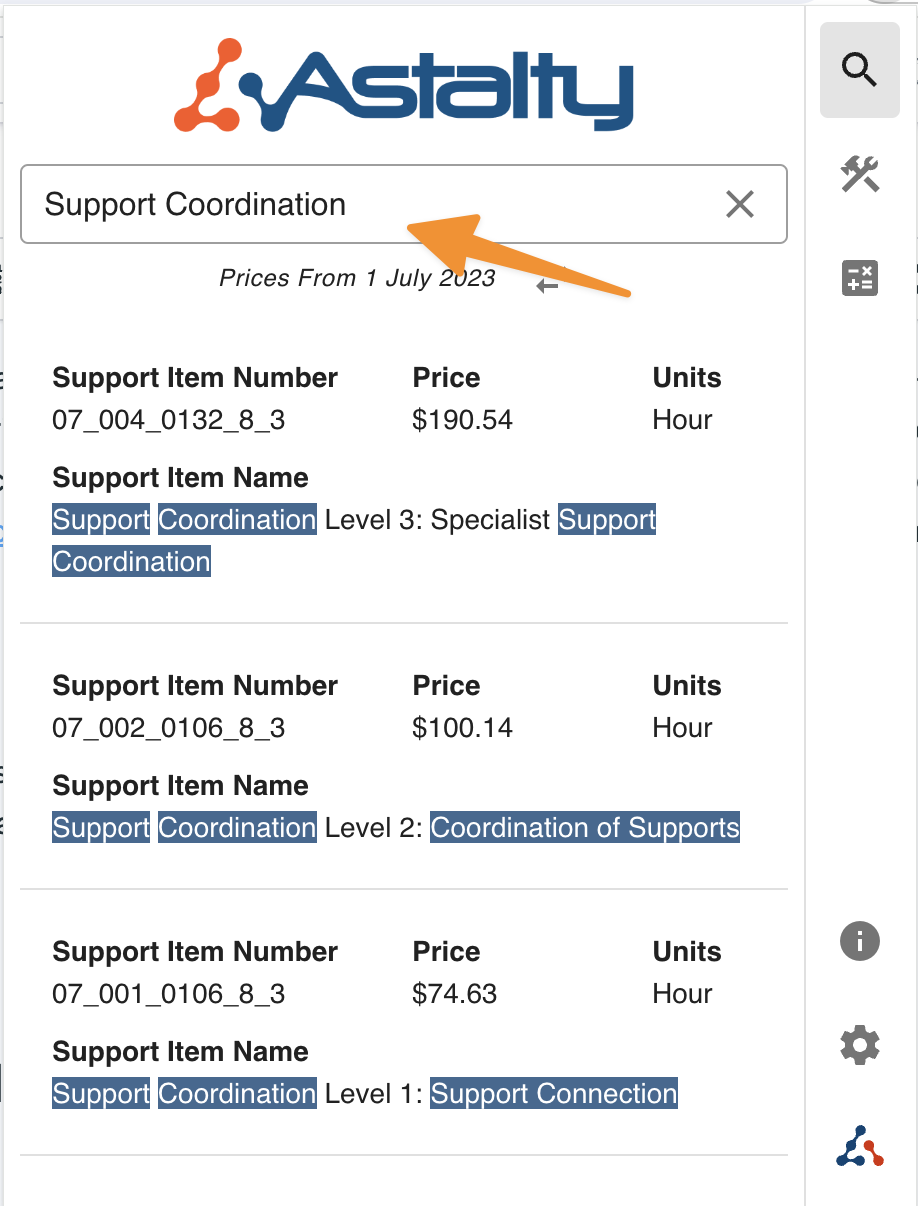 Our extension provides you with easy access to all the support items, putting the power of the NDIS Pricing Arrangements at your fingertips. To search using the Astalty for Chrome extension, click on the extension button.