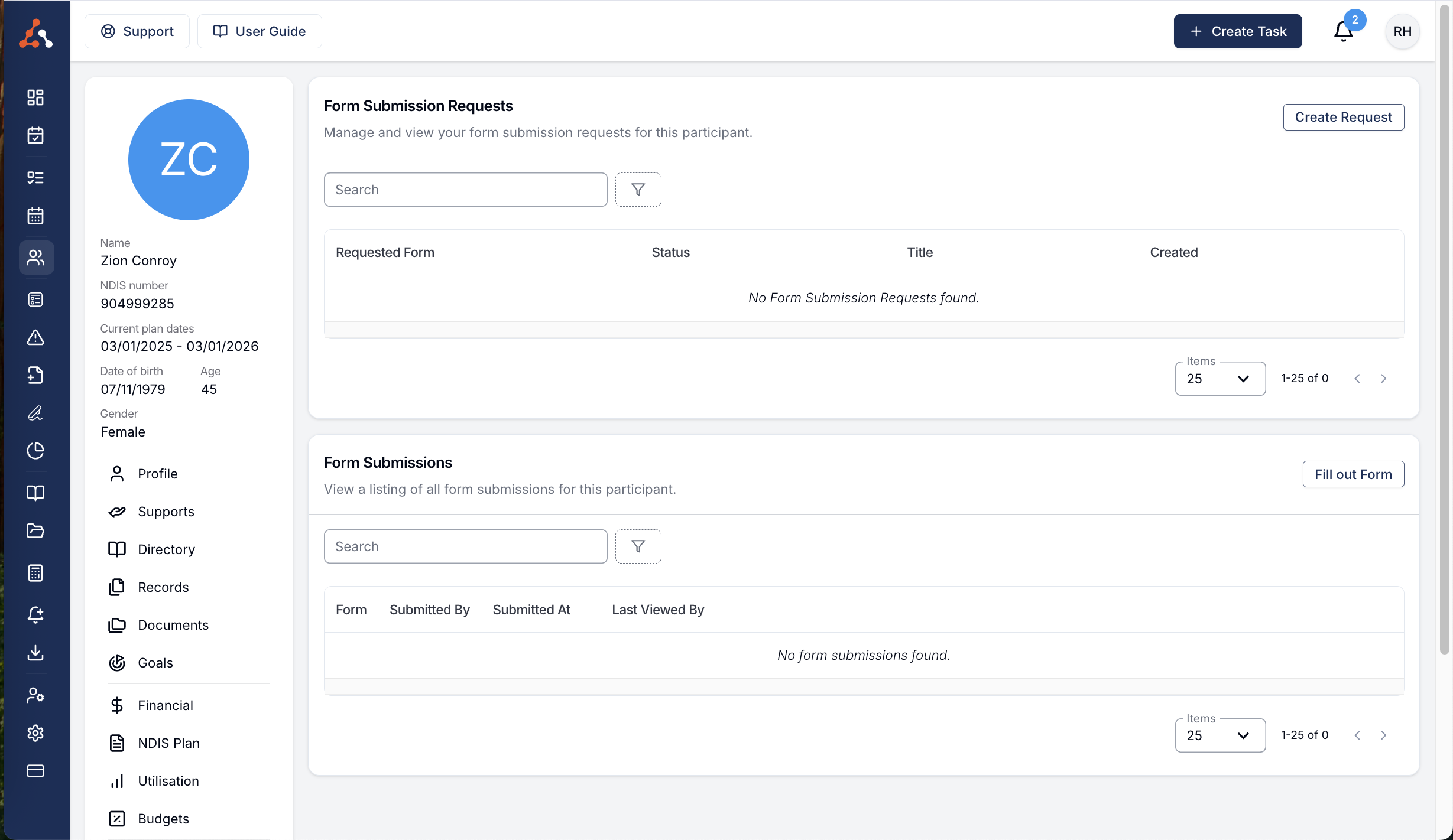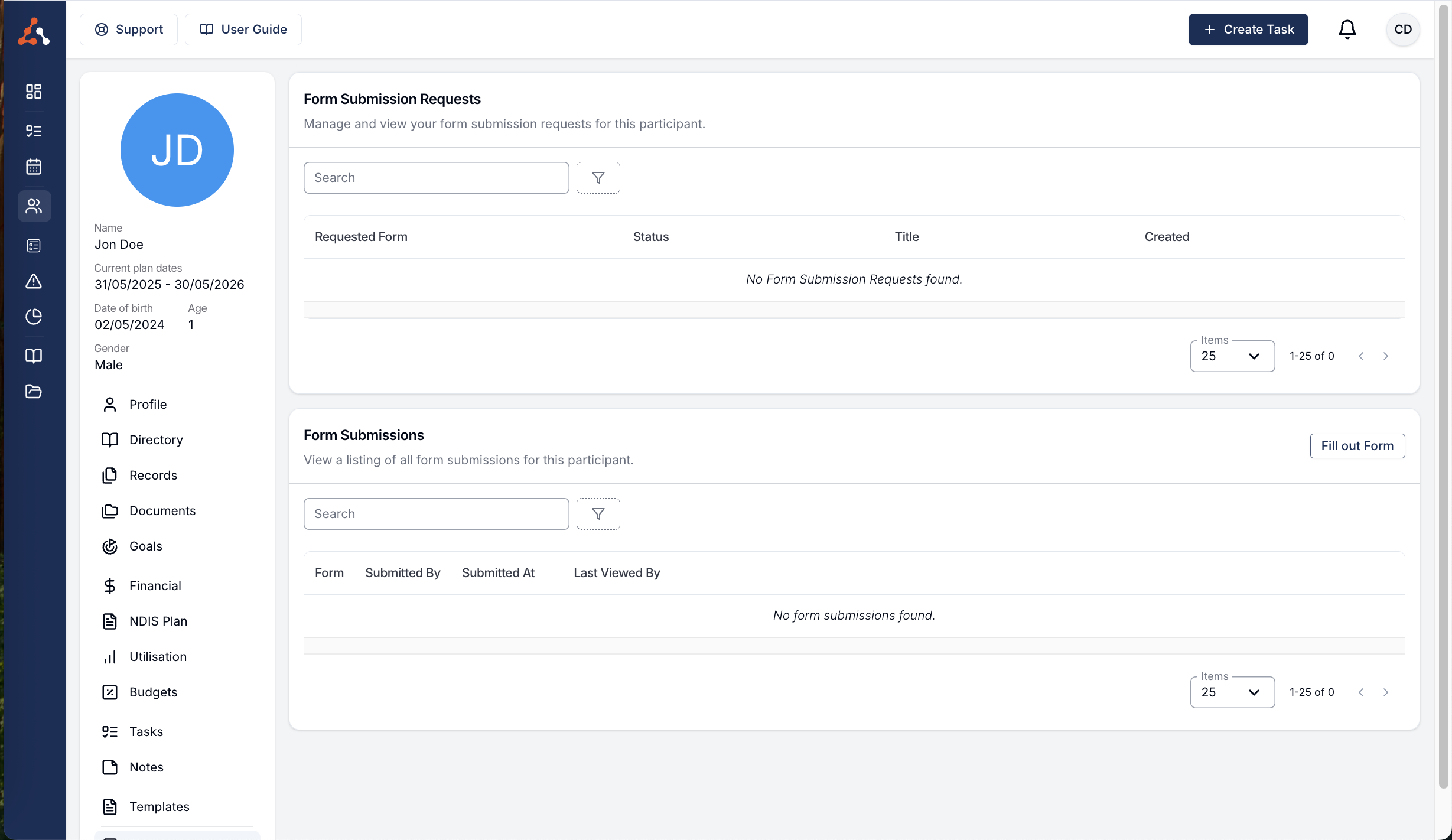 As a Manager or Team Member user you will be able to fill out the forms that you have permission to complete submissions for, for the participants within your caseload. You will also be able to see any forms completed that have been linked or created from the participants profile that you have permission to view submissions for.
