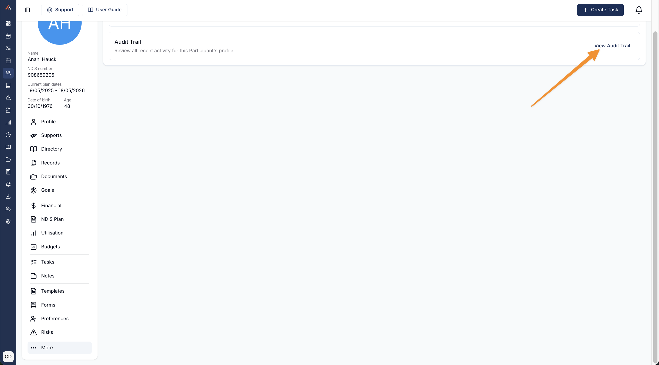 Simply select 'view audit trail' to view the audit trail for this participants profile.