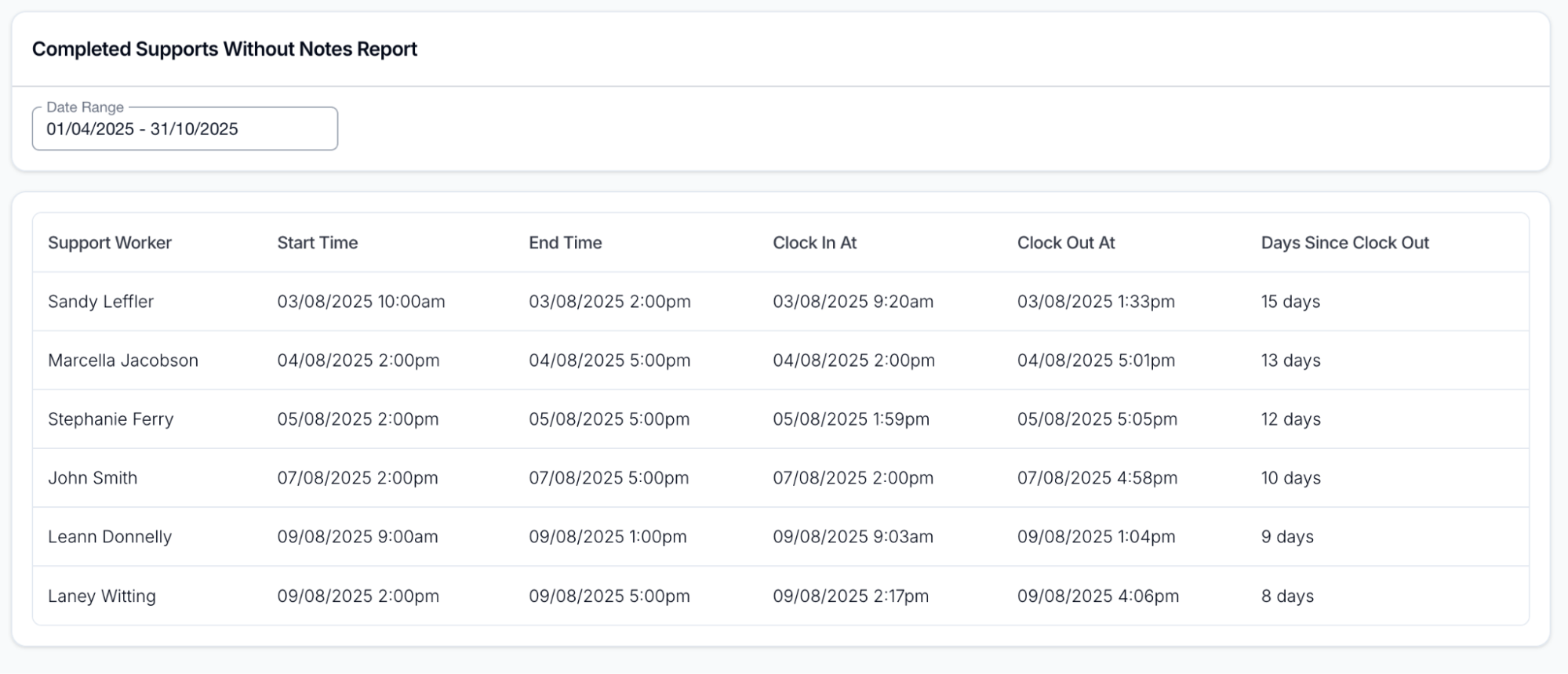 The Completed Supports Without Notes Report shows all completed supports that do not have an associated case note. This report helps you follow up with support workers to ensure notes are completed and to identify any trends or recurring issues. You can filter the results by date range.
