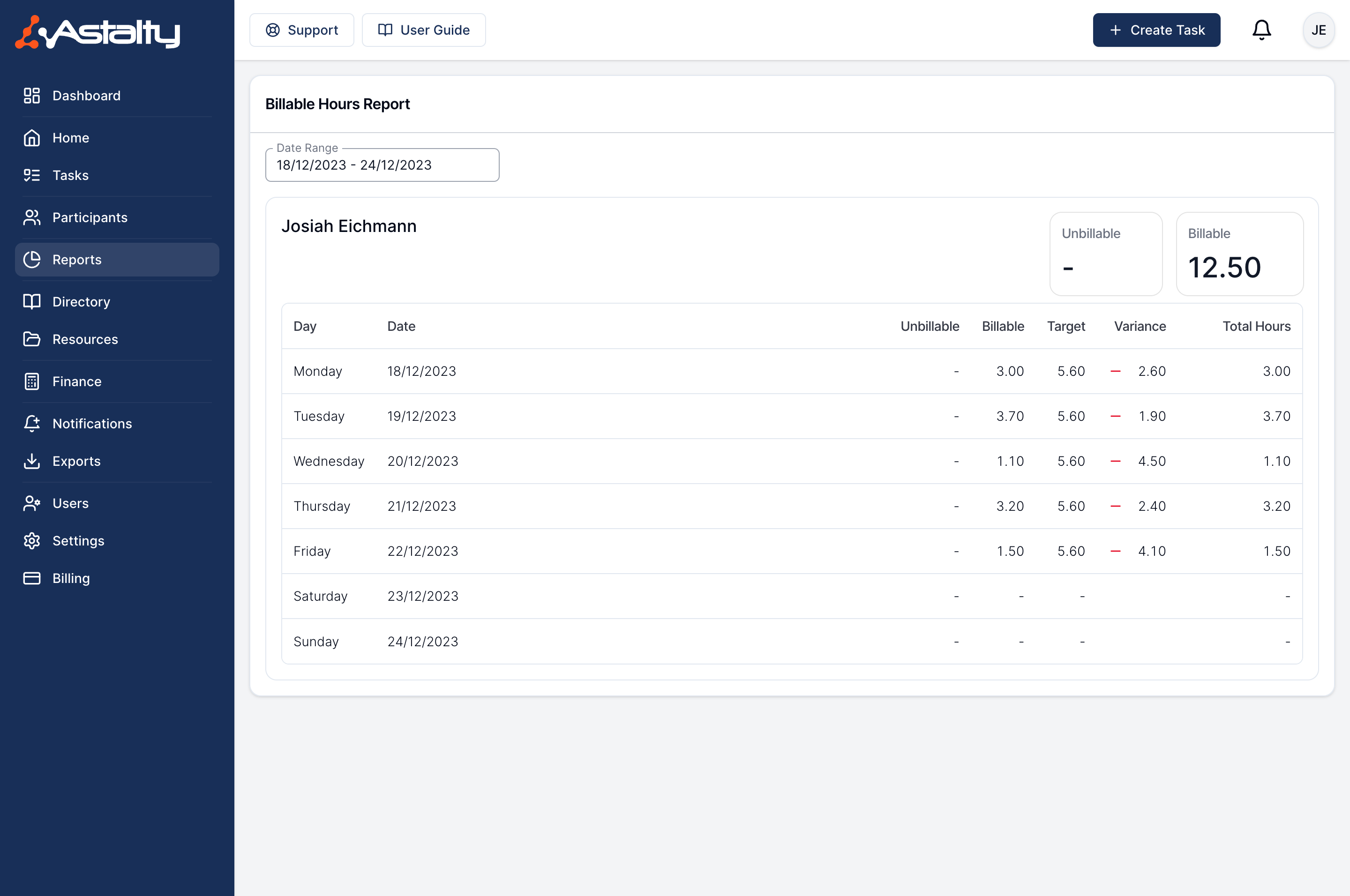 Astalty calculates your daily billable target based on your billable hours target set up on your profile. Astalty will assume a 5 day working week.
