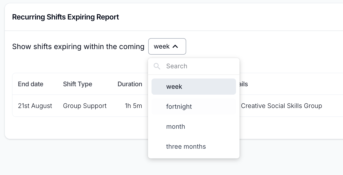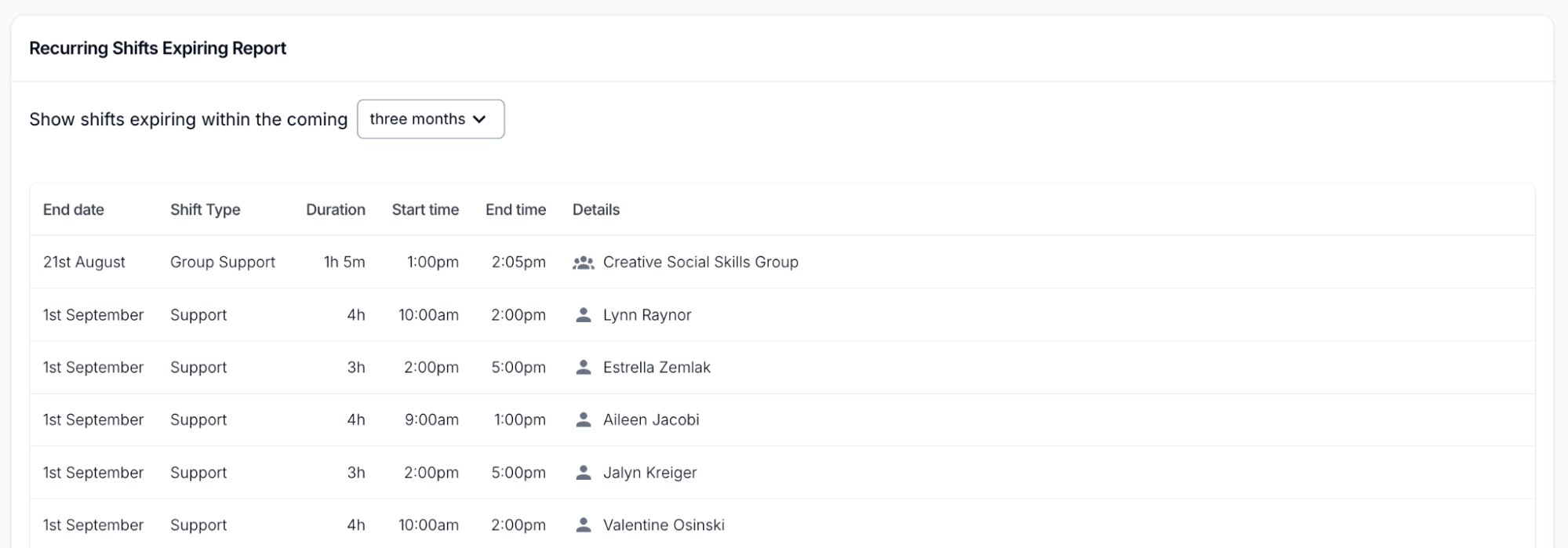 The Recurring Shifts Expiring Soon Report highlights any shifts that are due to expire within a selected timeframe (one week, fortnight, month, or three months). This helps you identify supports that are coming to an end and determine whether they need to be reinstated.