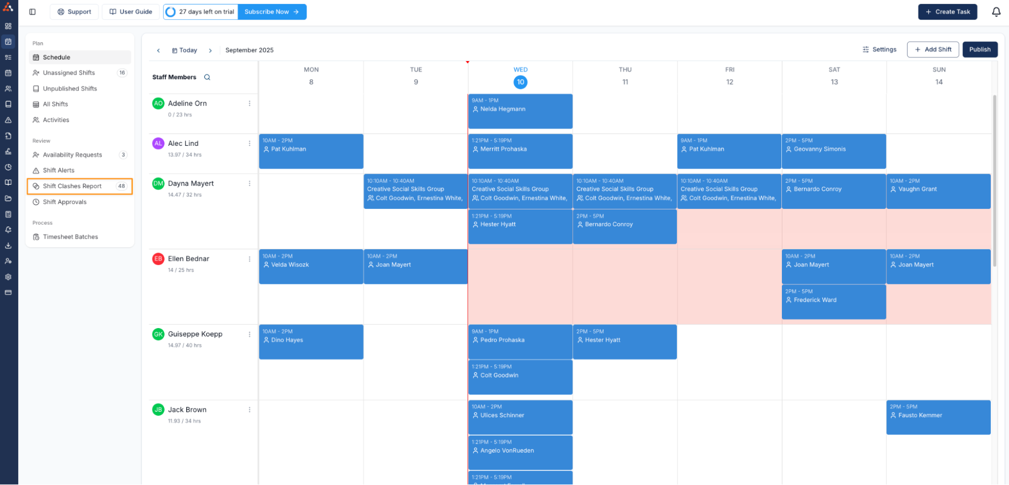 The Shift Clashes Report helps you quickly identify scheduling conflicts that could cause issues, such as: