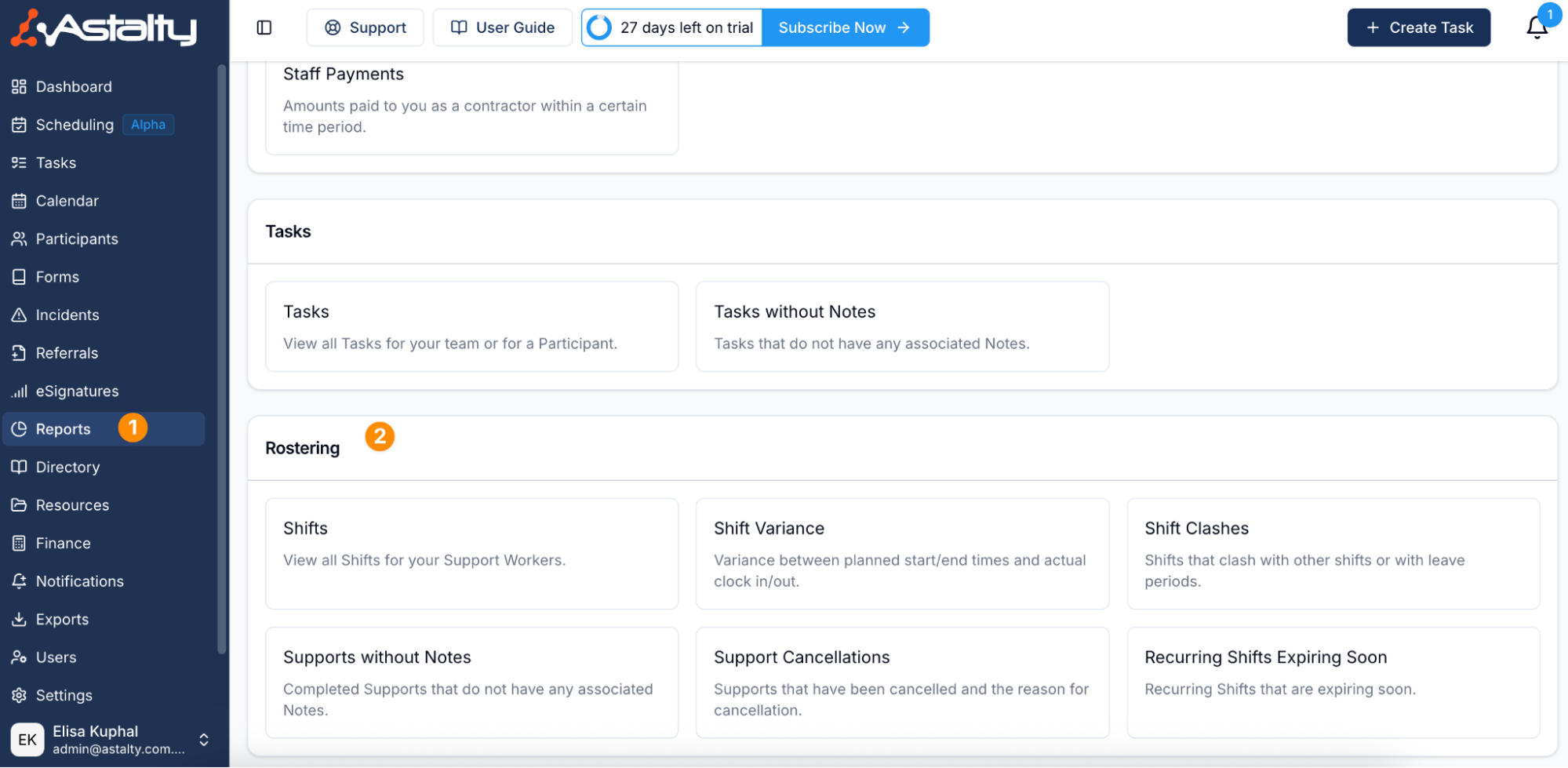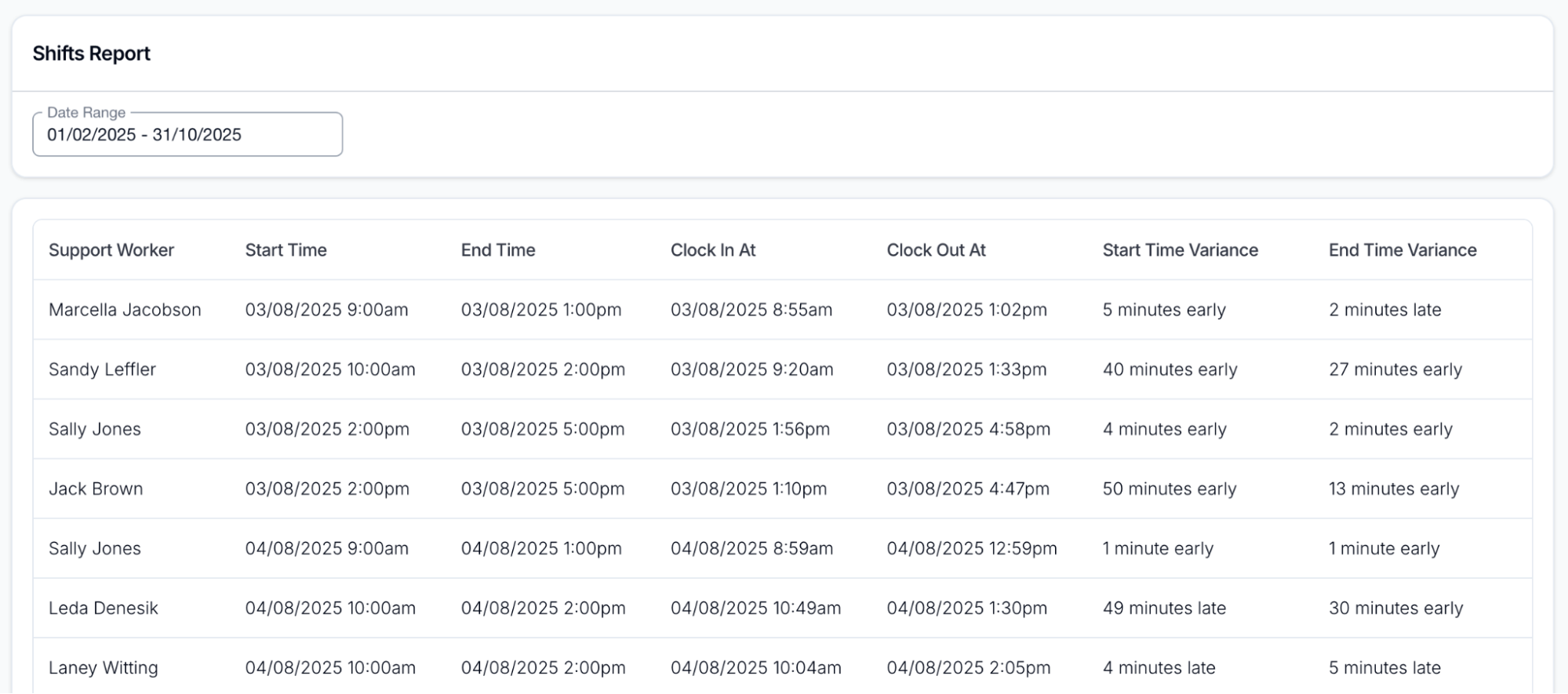 The Shift Variance Report shows the difference between the scheduled shift times and the actual clock-in and clock-out times recorded by support workers. This allows you to track lateness, early finishes, or extended shifts and compare scheduled vs. worked hours. The report can also be filtered by date range.
