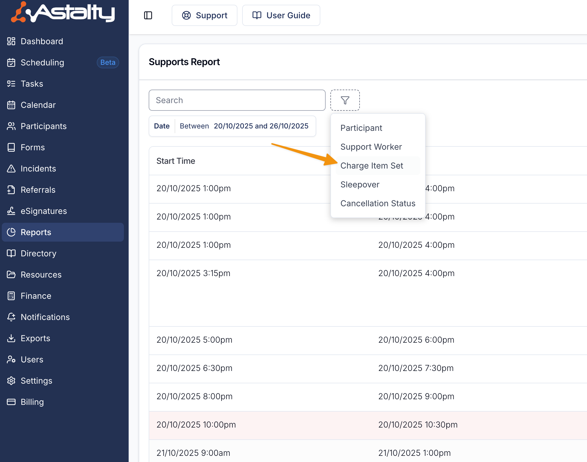 If you need to find supports that are using a particular charge item set, you can use the charge item set filter to define this.