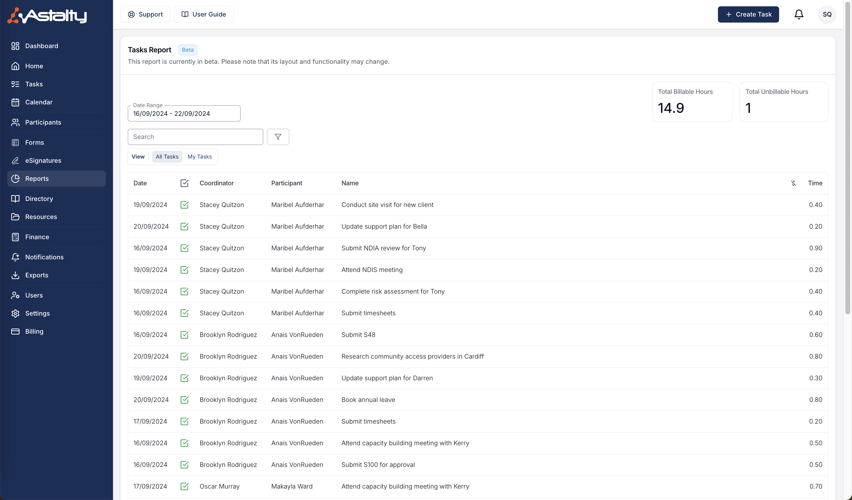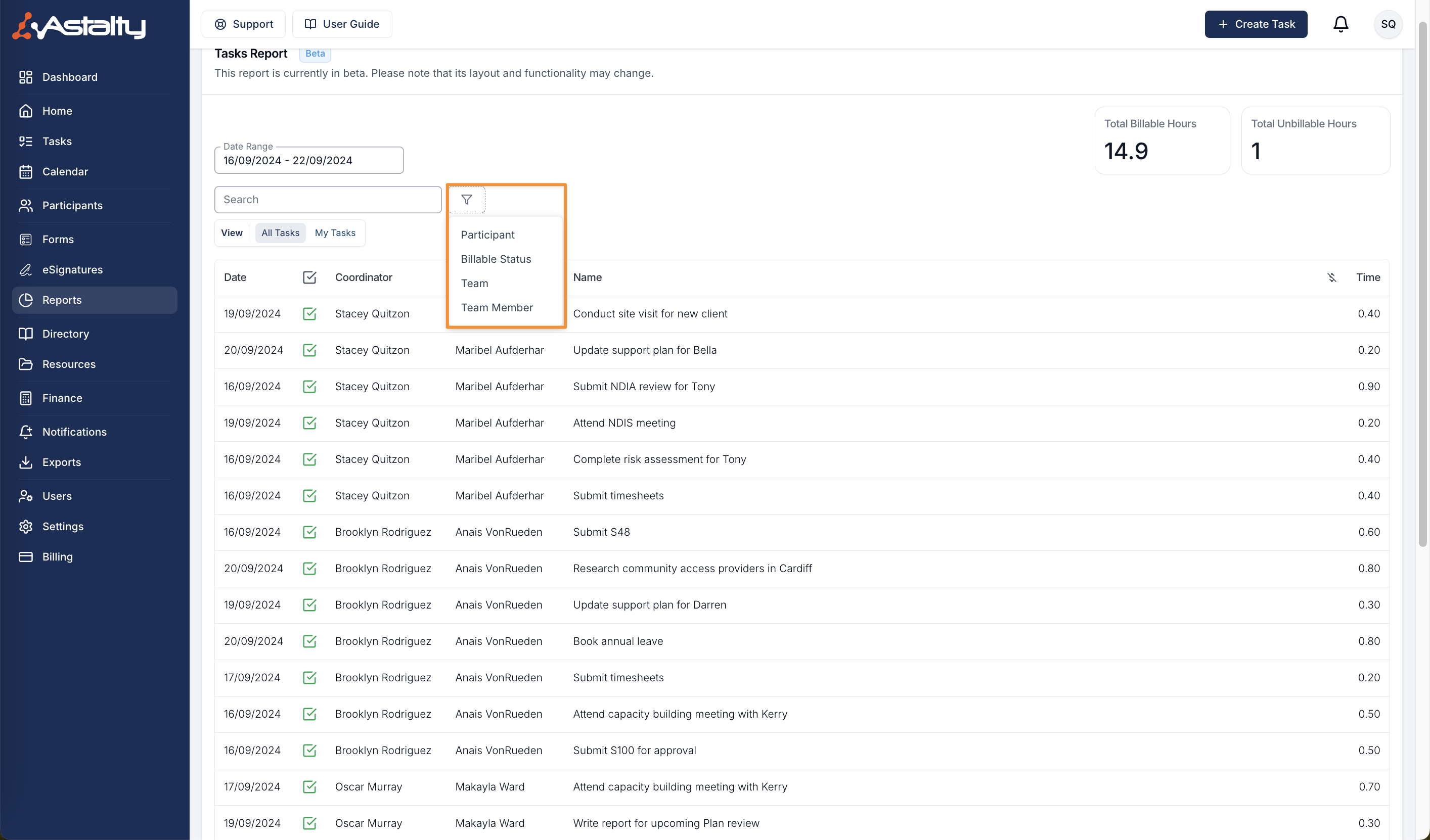 The Task Report is a report that a user can make use of to view all tasks made. You can filter this by participant or by team member. Within this report you can see the completion status, total hours billed and unbilled, set a date range and also search for participant, task and coordinator information.