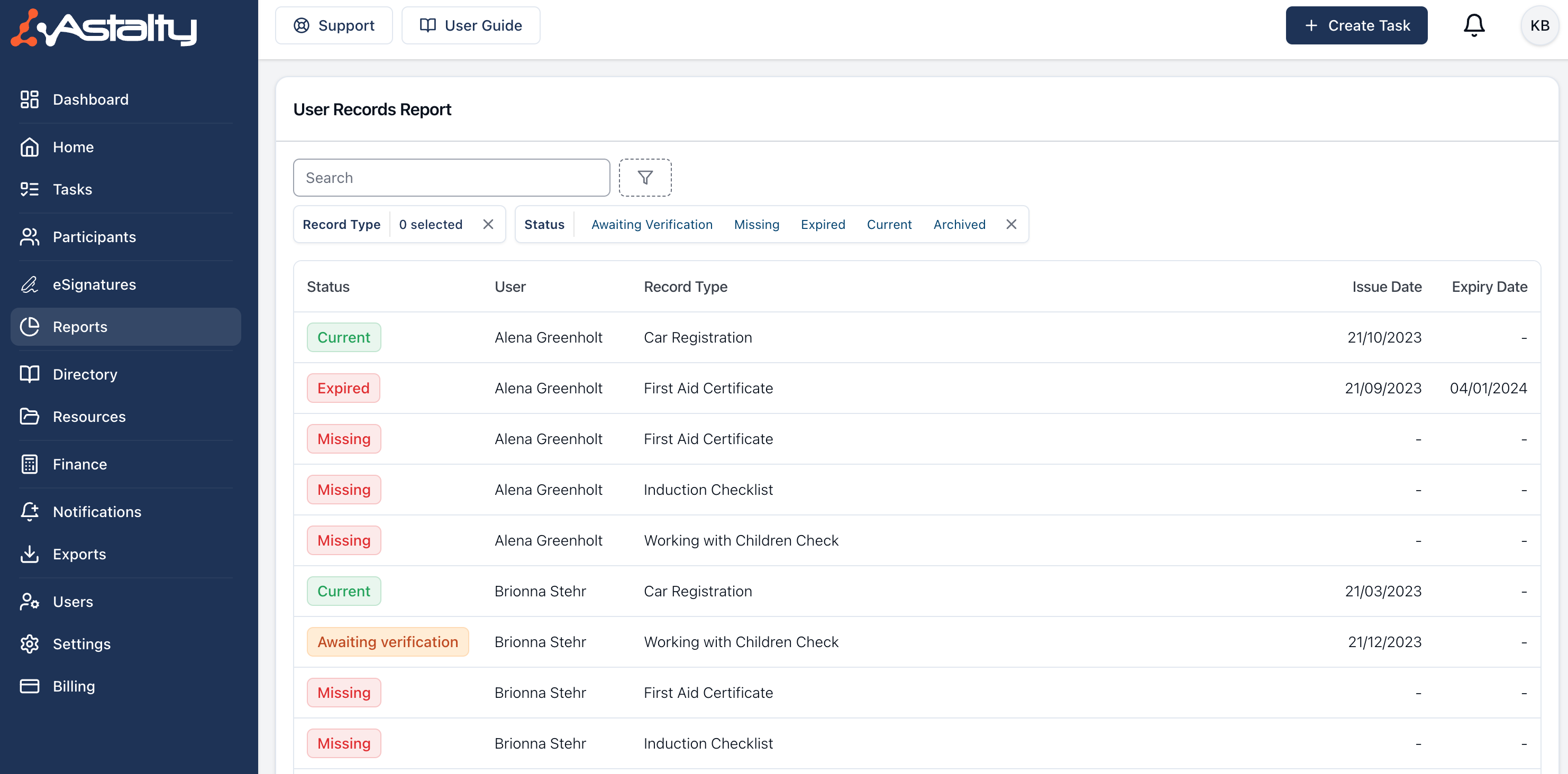 This report will show you an overview of User Records including current, missing, expired, and pending verification Records. This will help the Business Owner to easily monitor and manage Records of all Users for compliance.