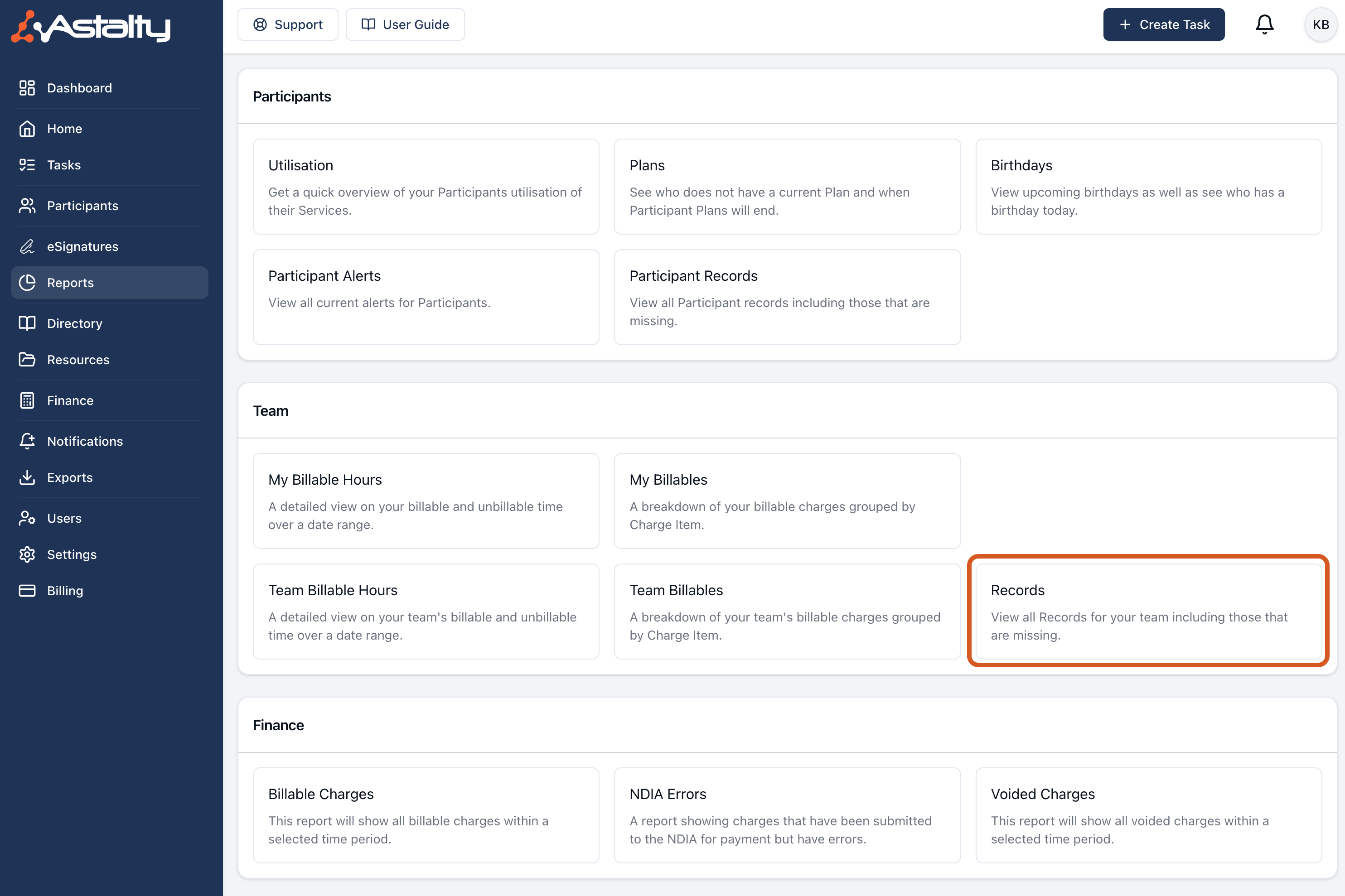 You can find the Records report by navigating to the Reports page in Astalty and clicking Records inside of the Team Panel.