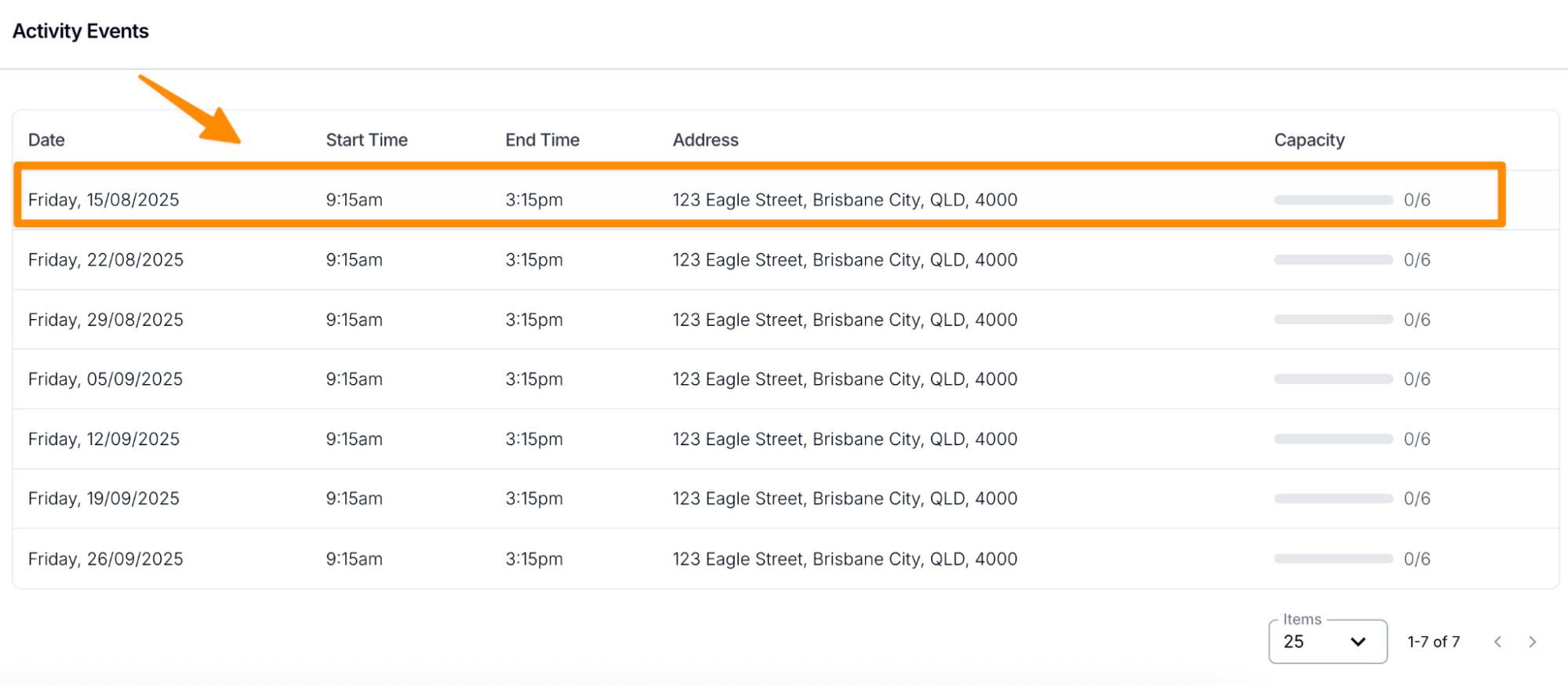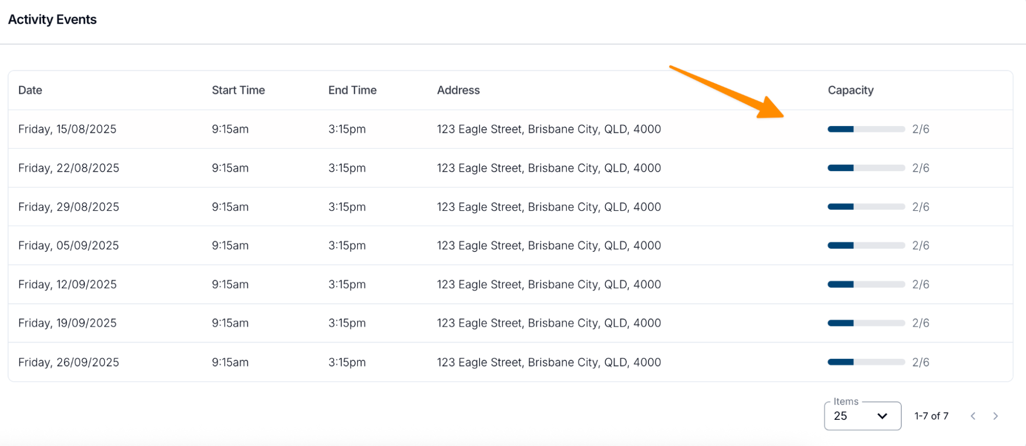 Once created, you can view the activity and all its scheduled instances. Capacity for each event is displayed under Activity Events.