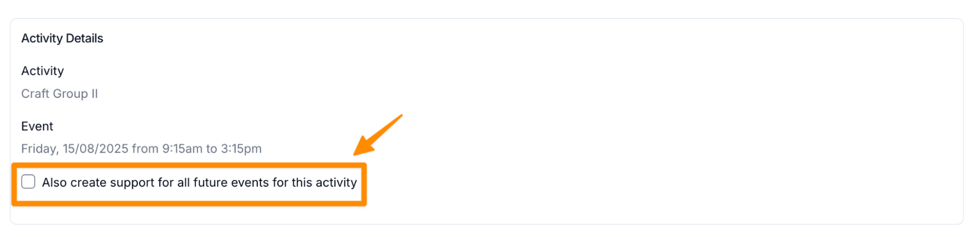 If not, select Also create support for all future events for this activity to apply the support to all remaining scheduled events.