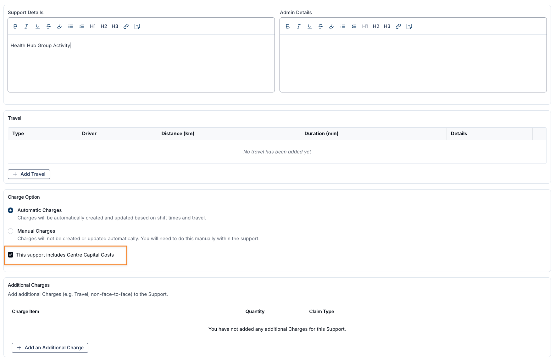 If you want to bill a different number of hours than the support provided (e.g., billing 2 hours of Centre Capital Costs for a 4-hour support), you can use the Additional/Manual Charges function.