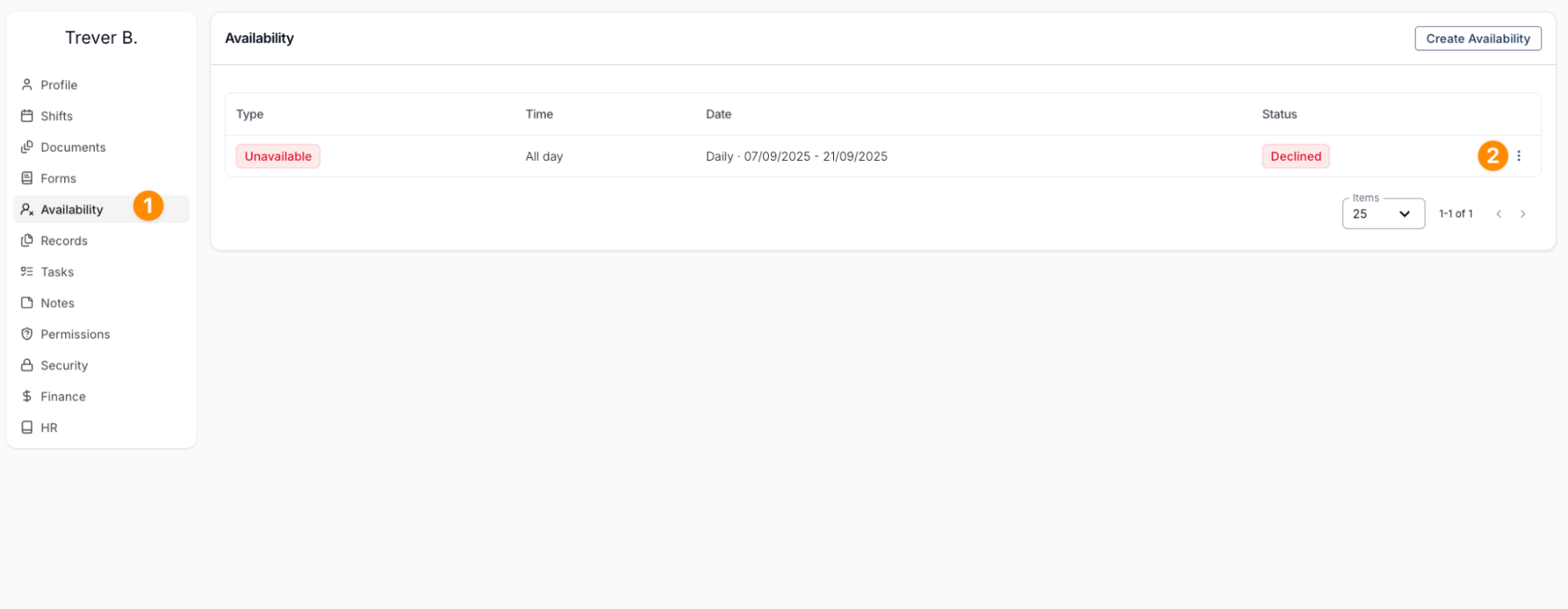 Users with Schedule permissions on desktop can also manage leave requests. To do this, go to the Users section, select the relevant user, and then open the Availability tab.