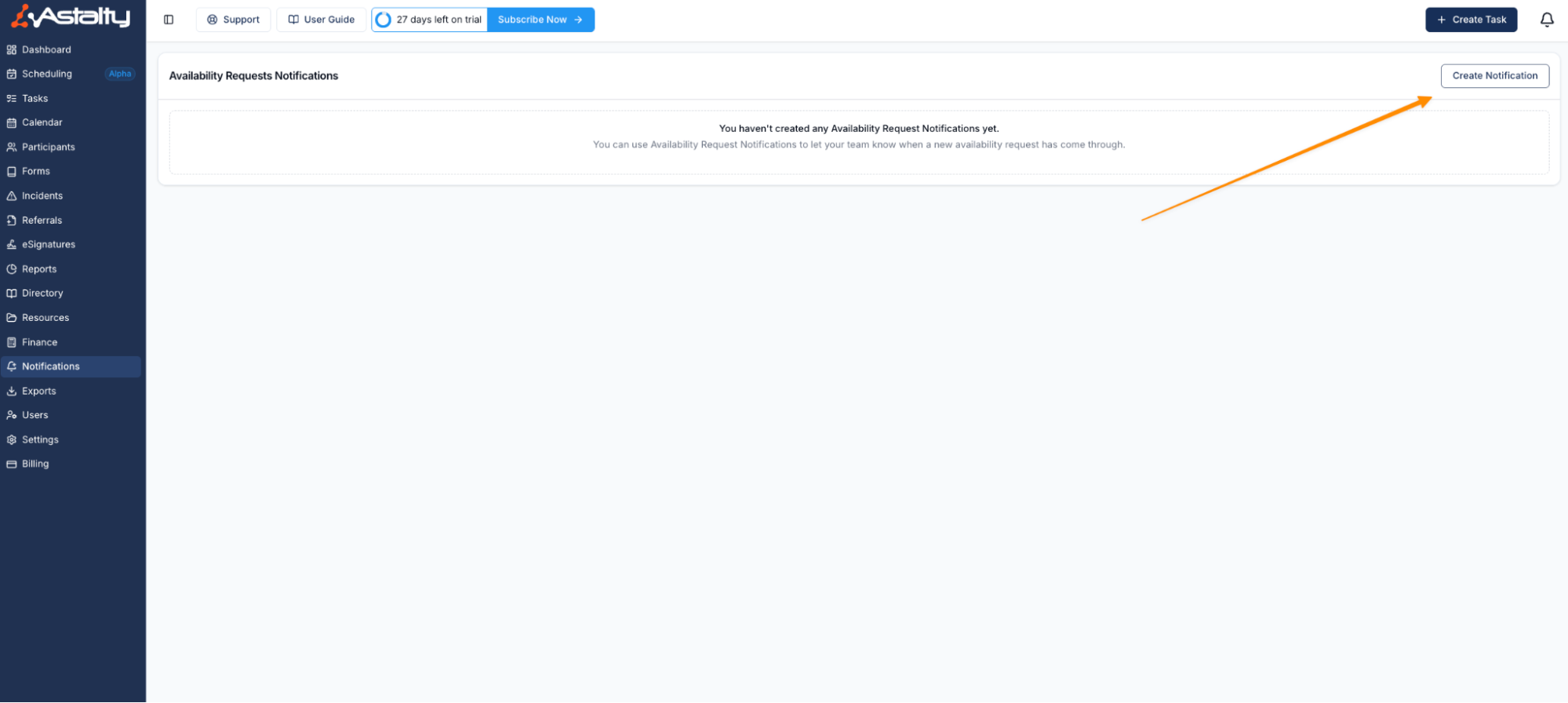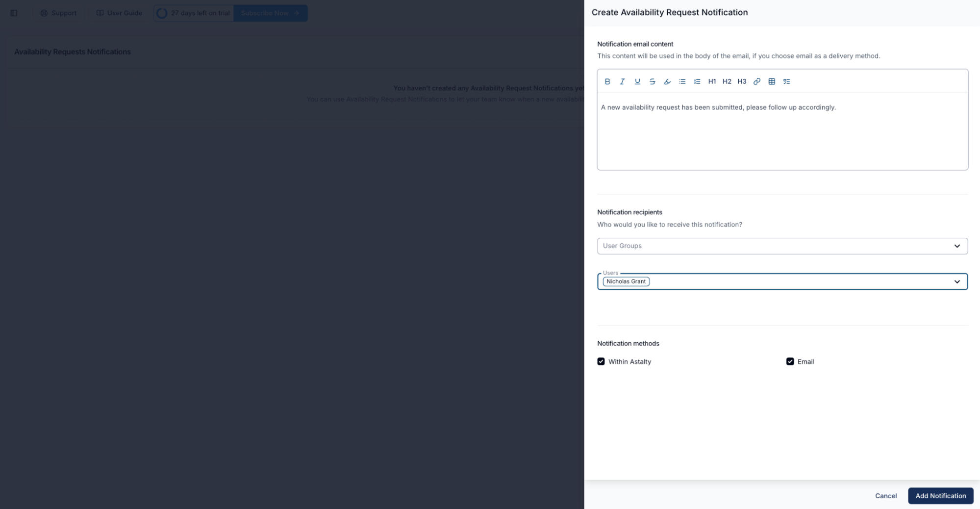 Leave requests and availability requests in Astalty follow the same process. To ensure these requests are actioned, you can configure notifications so that the appropriate person or team is alerted whenever a support worker submits a request.