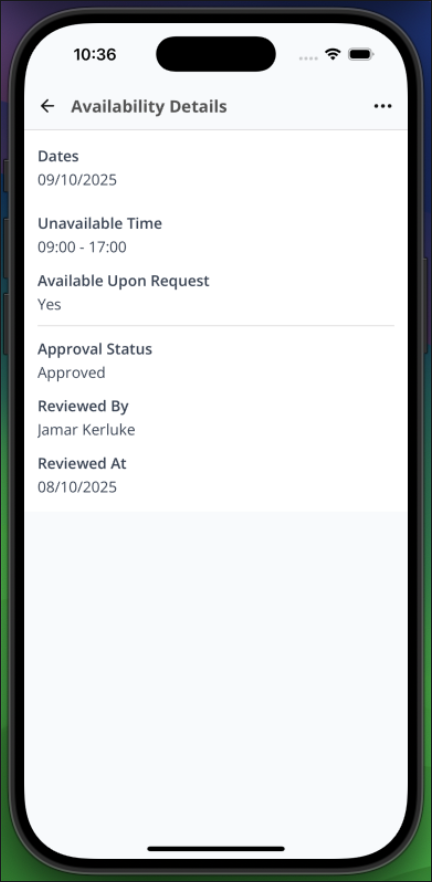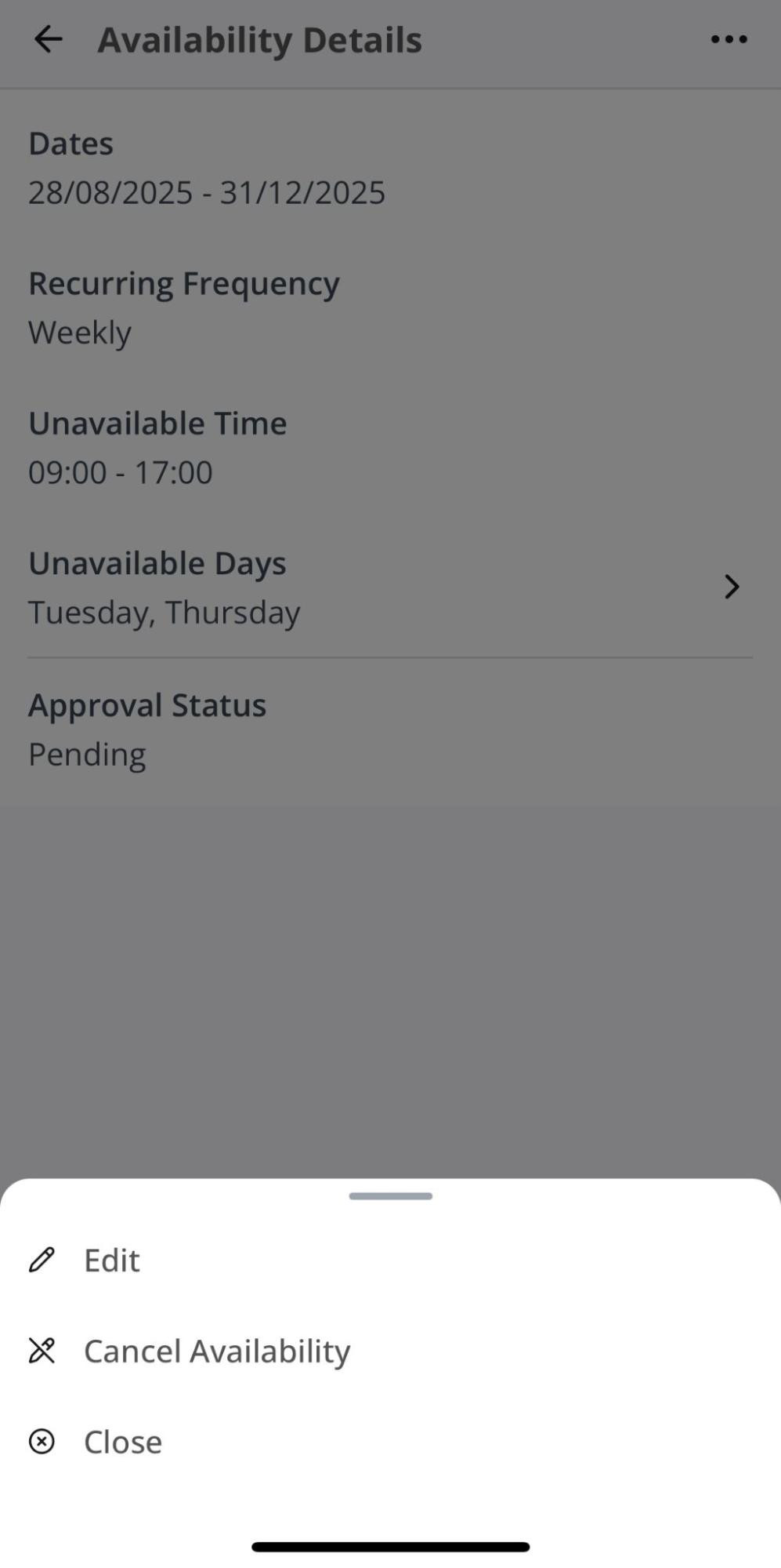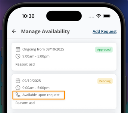 Once submitted, all leave requests (both once-off and recurring) will appear in the Manage Availability section of your profile. If you have selected to be available upon request, it will display with a phone icon and the text 'Available upon request'.