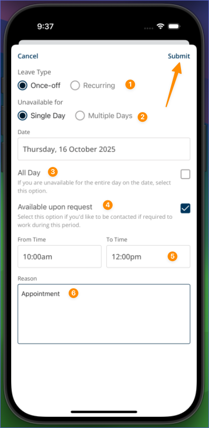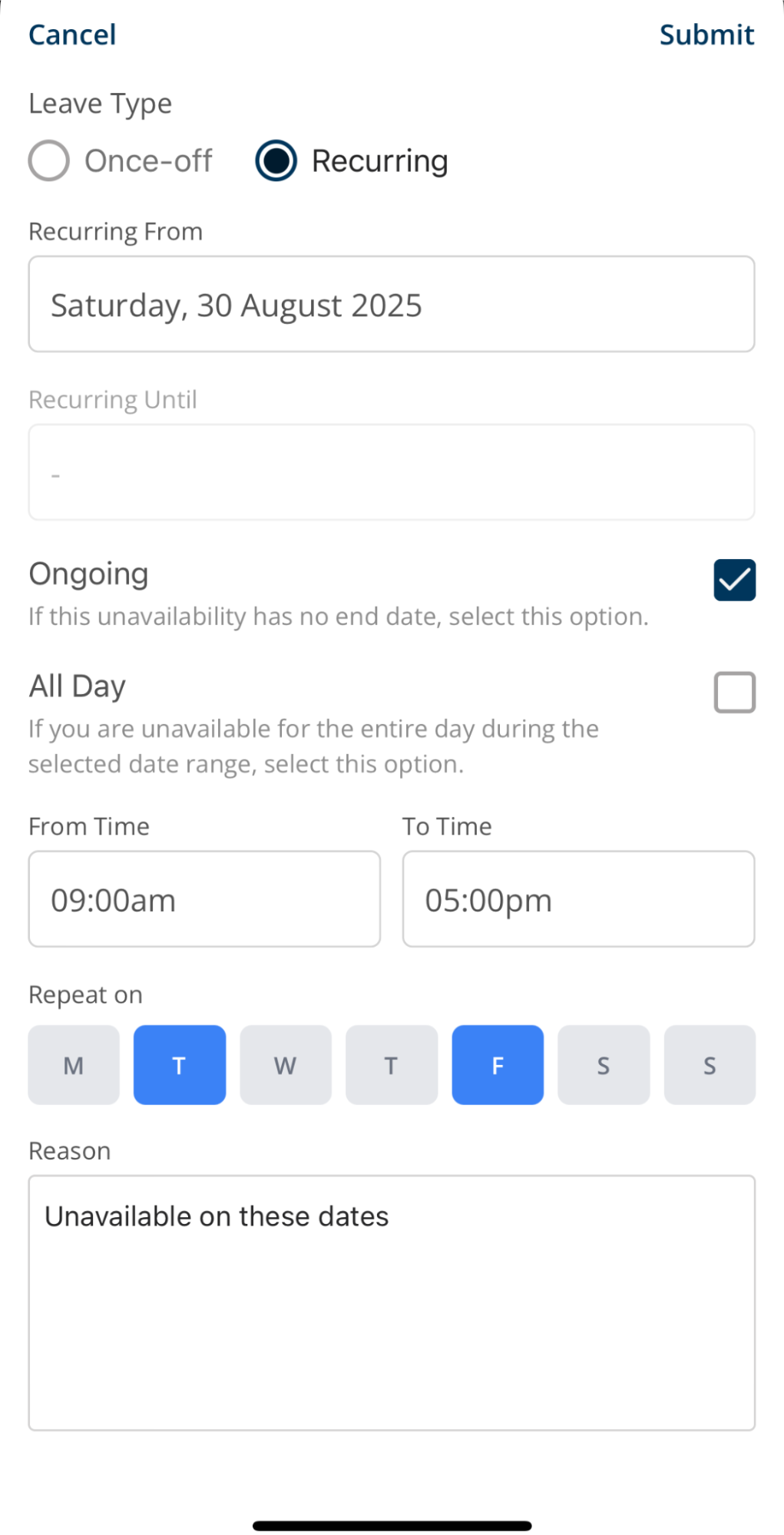 Support workers can manage their availability and submit leave requests directly in the app. Leave can be recorded as a once-off (single or multiple days) or as recurring (regularly repeating) leave. This ensures rostering is accurate and helps avoid scheduling conflicts.